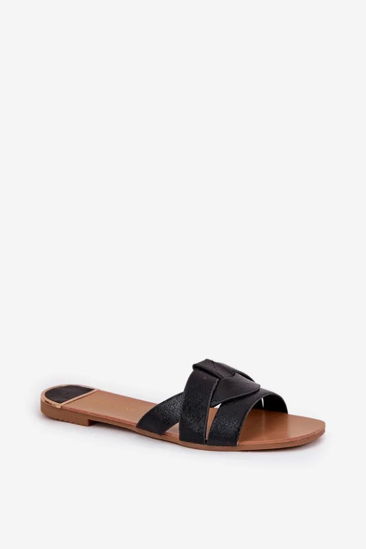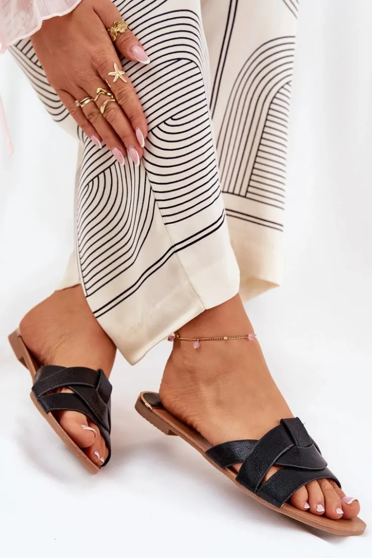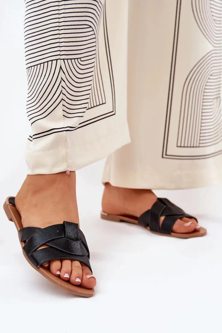 Płaskie klapki damskie z materiału tekstylnego, które charakteryzują się przeplatającymi się paskami z przodu, nadającymi im delikatnego uroku. Klasyczny fason sprawia, że będą doskonałym wyborem do wielu stylizacji, łącząc wygodę z prostym, eleganckim wyglądem. Przy wyborze rozmiaru prosimy sugerować się tabelą rozmiarów.