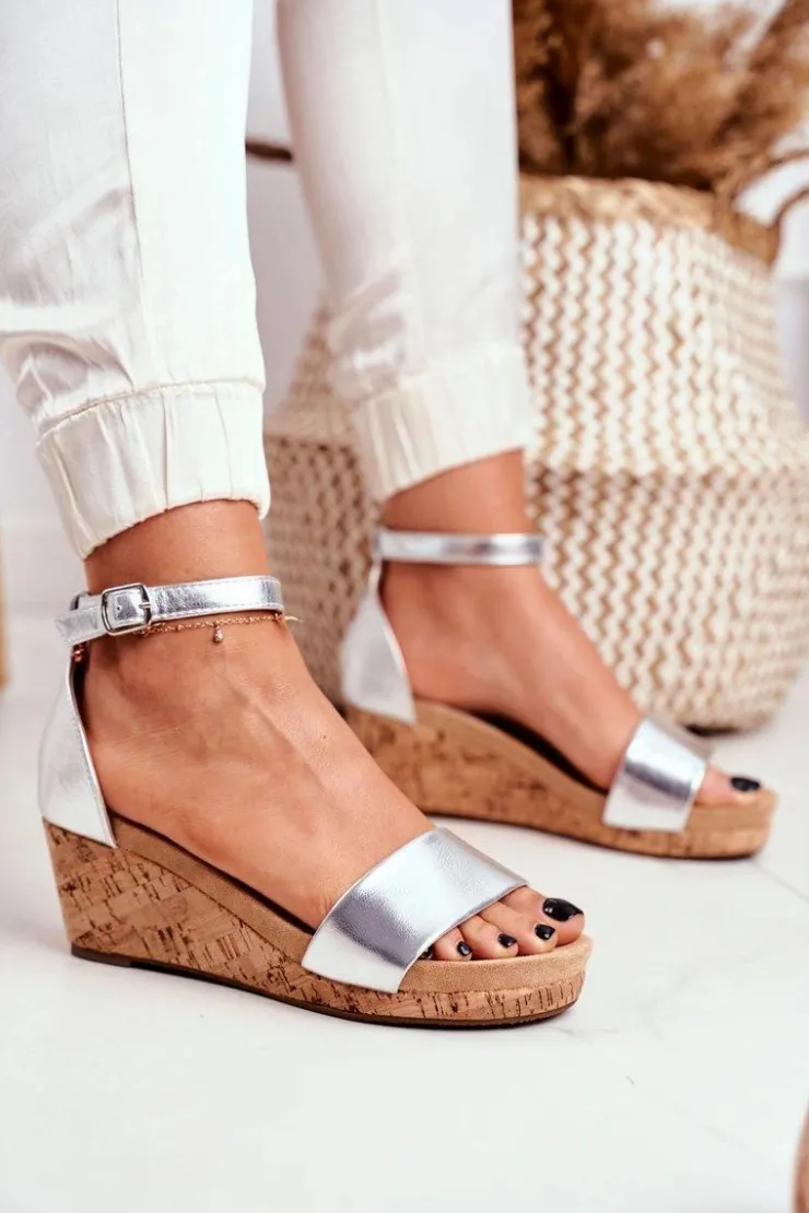 Clearance Boto Sandałki Damskie Na Koturnie Srebrne MarryMe