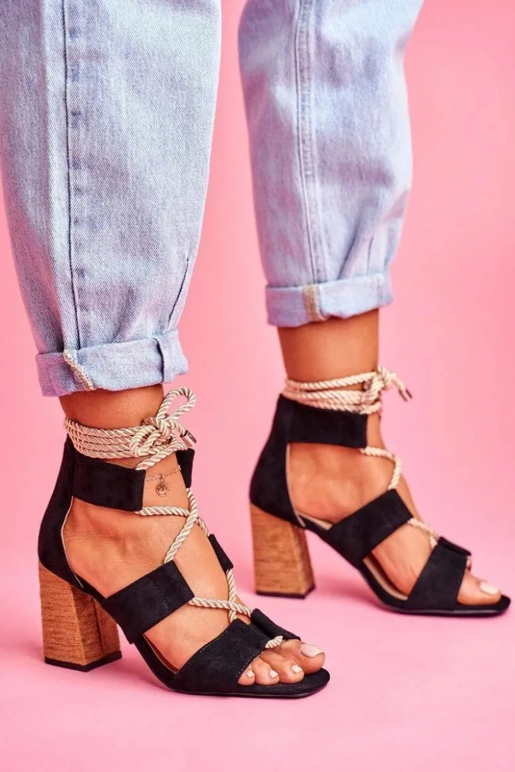 Clearance Boto Sandały Damskie Na Słupku Wiązane Zamszowe Czarne Amore