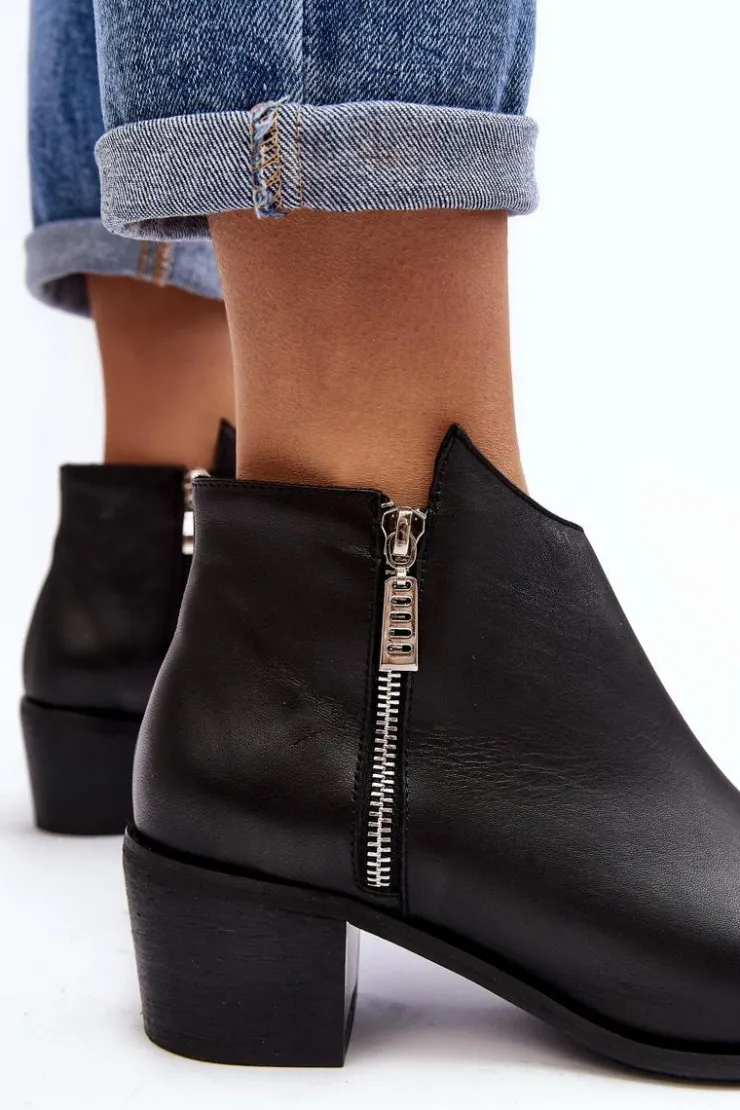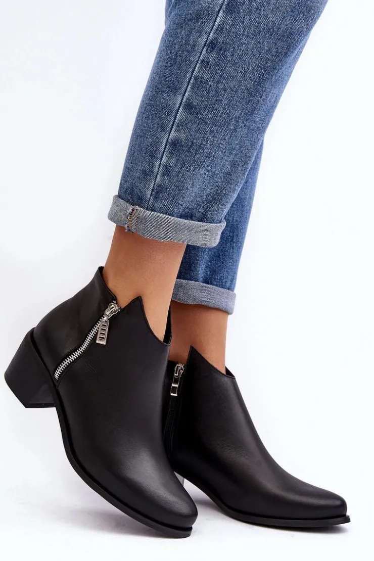 Botki damskie wykonane z naturalnej skóry. Ocieplone wewnątrz kocem obuwniczym. Obcas w postaci niskiego słupka. Cholewka lekko za kostkę z suwakami. Usztywniany zapiętek zapewni stabilizację stopy. Noski w migdał. Ten klasyczny fason powinien znaleźć się w Twojej szafie! Przy wyborze rozmiaru prosimy sugerować się tabelą rozmiarów.