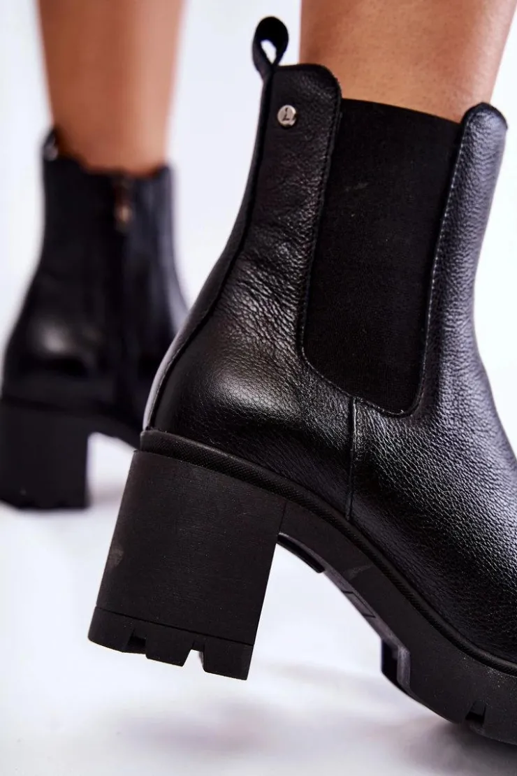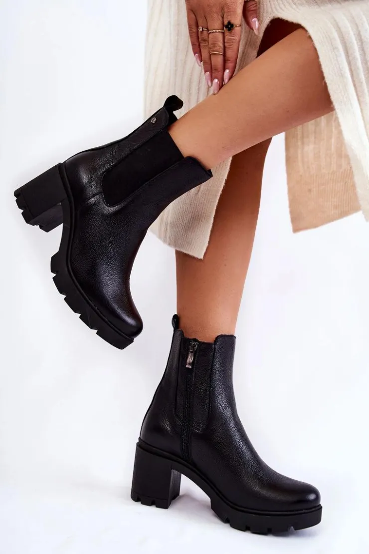 Botki na masywnej platformie z szerokim obcasem w stylu sztybletów. Posiadają wysoką, sięgającą ponad kostkę cholewkę. Wykonane ze skóry naturalnej. Posiadają dodatkową, elastyczną wstawkę, dzięki której cholewka świetnie dopasuje się do tęgości nogi. Buty zostały ocieplone kocem obuwniczym. Botki doskonale sprawdzą się w jesiennych stylizacjach. Przy wyborze rozmiaru prosimy kierować się tabelą rozmiarów