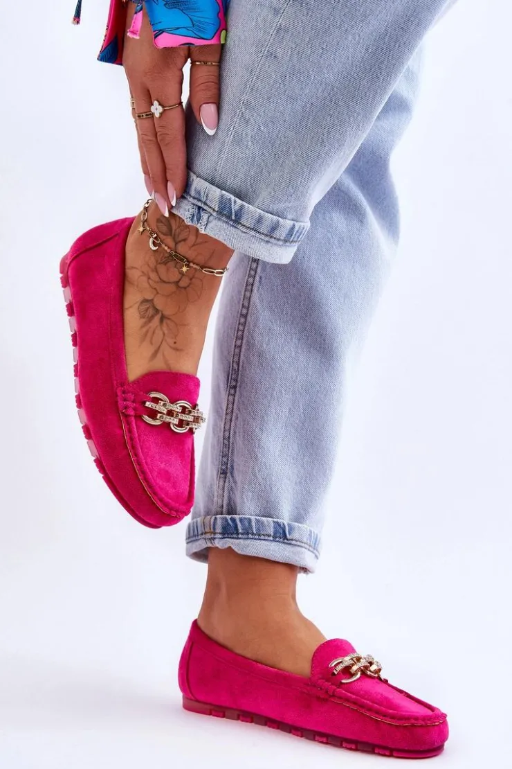 Mokasyny damskie zostały wykonane z eko zamszu. Posiadają na przodzie ozdobny łańcuszek z dżetami. Mokasyny zostały osadzone na platformie z gumową, antypoślizgową podeszwą. Miękka wkładka z eko skóry zapewni komfortowe użytkowanie. Koniecznie powinnaś je mieć! Przy wyborze rozmiaru prosimy sugerować się tabelą rozmiarów.