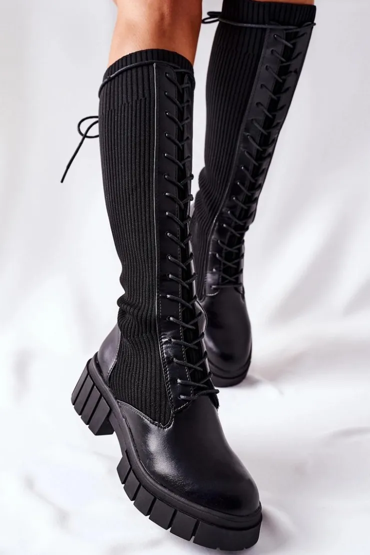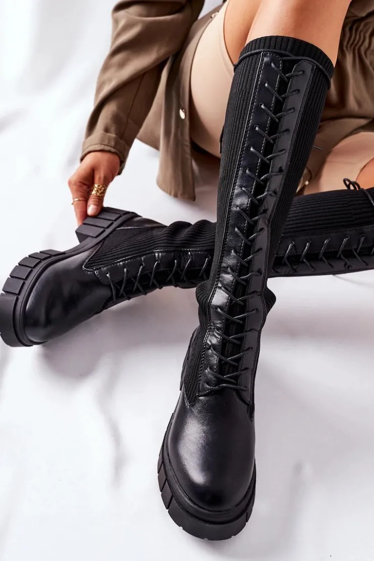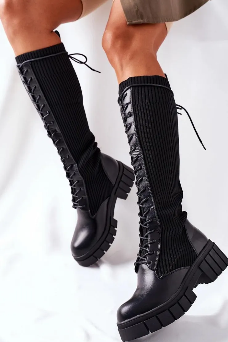 Wysokie sznurowane kozaki. Cholewka w postaci skarpety. Sznurowanie po całej długości zapewni odpowiednie dopasowanie do nogi. Przy wyborze rozmiaru prosimy sugerować się tabelą rozmiarów.
