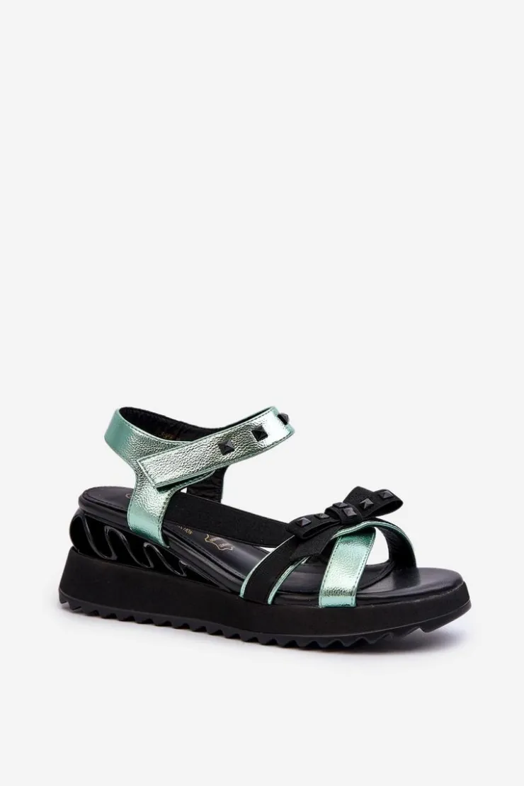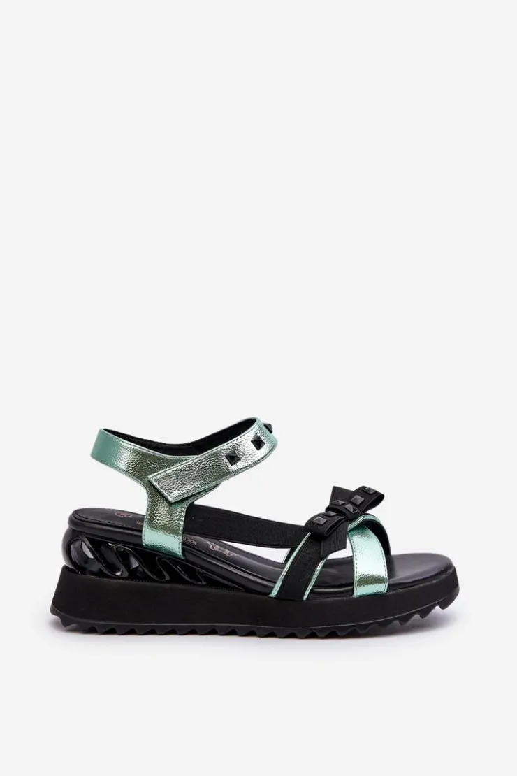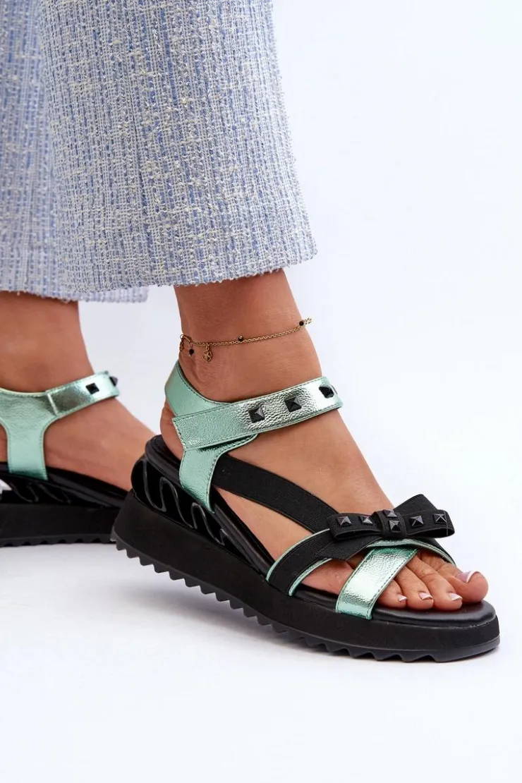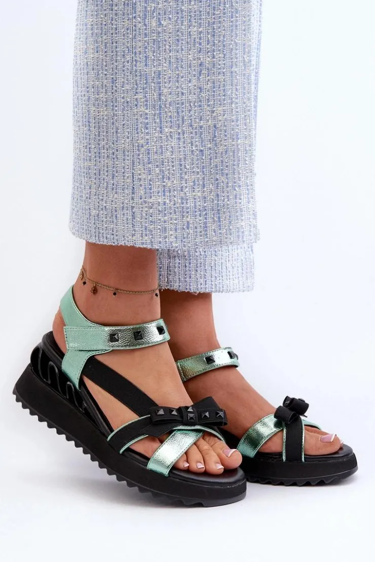 Niezwykle stylowe sandały damskie osadzone na platformie z koturnem. Praktyczne zapinanie na rzep zapewnia szybkie i wygodne dopasowanie do stopy. Kokardka z przodu nadaje im uroku i delikatności. Model ten pewnością przyciągnie spojrzenia! Przy wyborze rozmiaru prosimy sugerować się tabelą rozmiarów.
