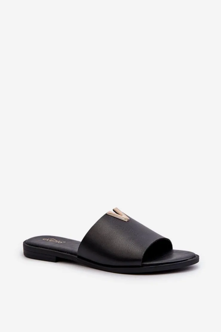 Klapki damskie wykonane ze skóry ekologicznej. Złoty element doda blasku Twojej letniej stylizacji. Osadzone na płaskim obcasie. Model ten będzie idealnym wyborem na wiele okazji! Przy wyborze rozmiaru prosimy sugerować się tabelą rozmiarów.