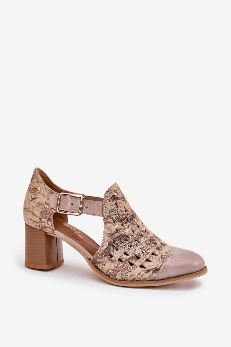 Botki z noskiem w kształcie migdała. Posiadają regulowany pasek zapinany przy kostce na sprzączkę oraz gumkę. Po bokach cholewki znajdują się efektowne wycięcia. Wykonane z naturalnej skóry. Posiadają usztywniany zapiętek. Urozmaicone ażurowym wzorem na przodzie cholewki. Miękka, skórzana wkładka pozwoli na komfortowe użytkowanie obuwia, nawet przez cały dzień! Obcas w postaci stabilnego słupka. Przy wyborze rozmiaru prosimy sugerować się tabelą rozmiarów.