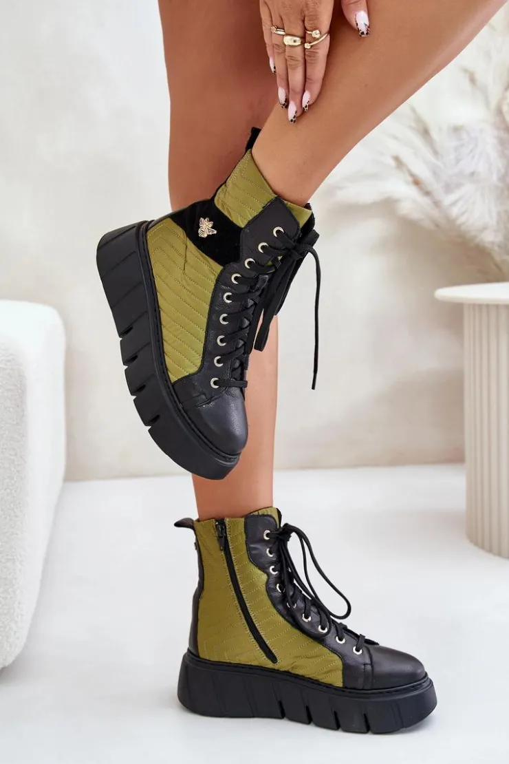 Botki marki Maciejka, wykonane z połączenia wysokiej jakości skóry naturalnej i materiału tekstylnego. Osadzone na solidnej platformie, łączą styl z wygodą. Model ten posiada zarówno zamek, jak i sznurowanie, co zapewnia doskonałe dopasowanie i łatwość zakładania. Wnętrze butów jest ocieplone, co sprawia, że są idealne na chłodniejsze dni. Przy wyborze rozmiaru prosimy sugerować się tabelą rozmiarów.