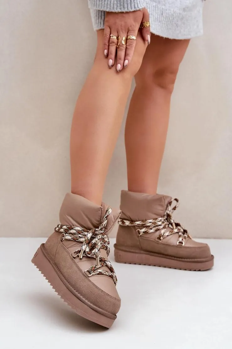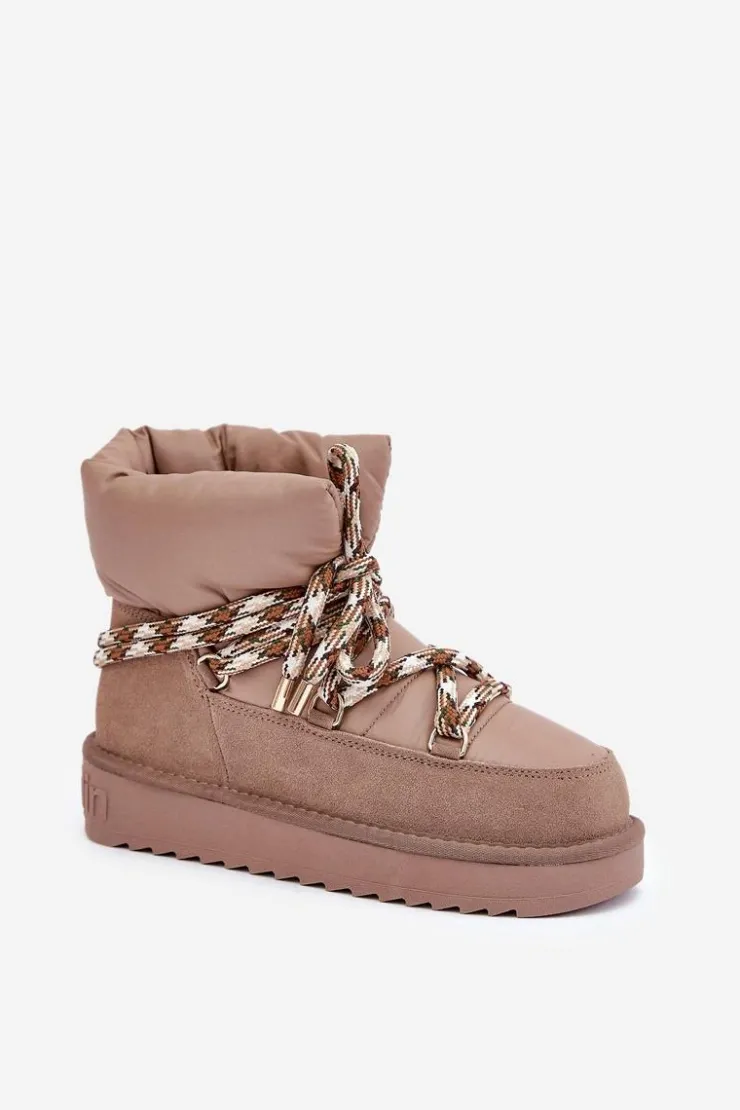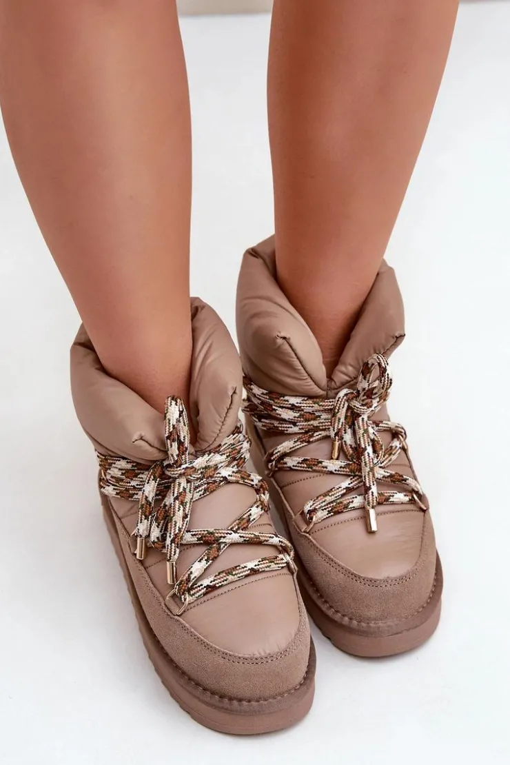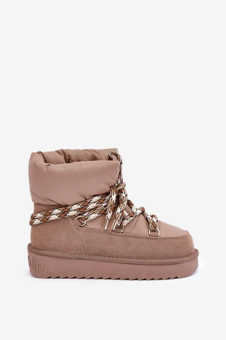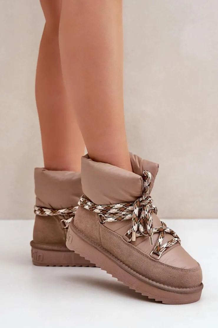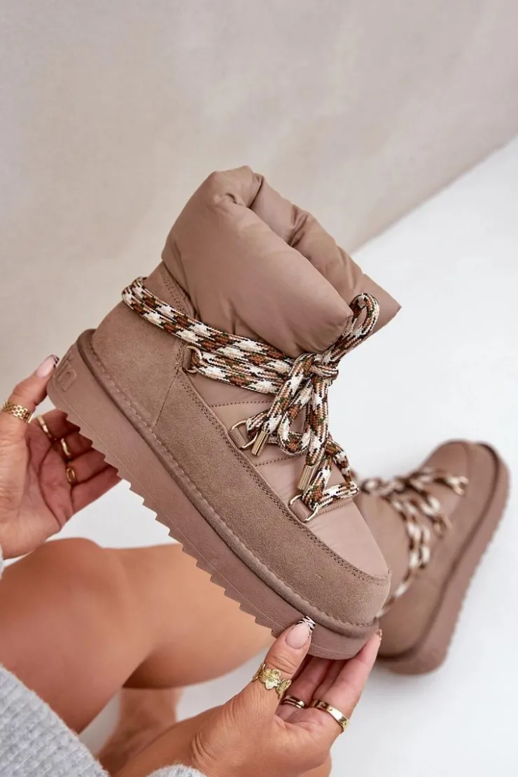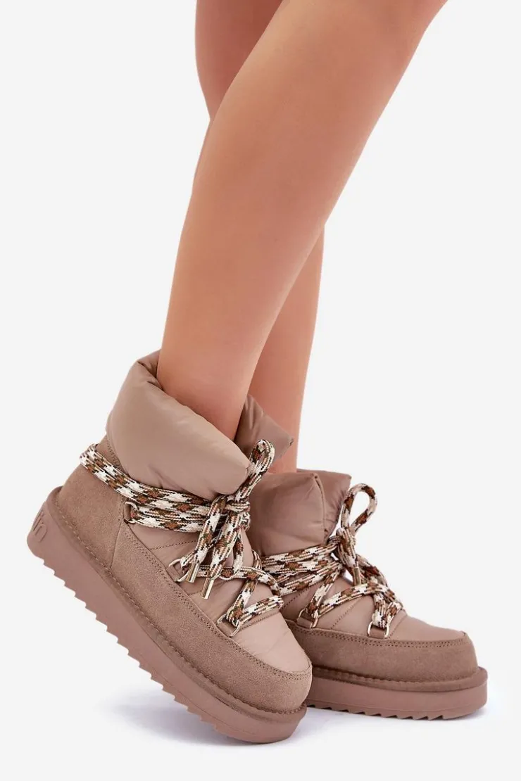 Damskie śniegowce wykonane z połączenia wysokiej jakości tkaniny syntetycznej i naturalnego zamszu. Osadzone na podeszwie z gumowego tworzywa. Prosty krój z syntetyczną podszewką zapewniającą doskonałe ciepło. Grube sznurowanie zapewni doskonałe dopasowanie do stopy. Koniecznie powinnaś je mieć w swojej zimowej garderobie! Przy wyborze rozmiaru prosimy sugerować się tabelą rozmiarów.