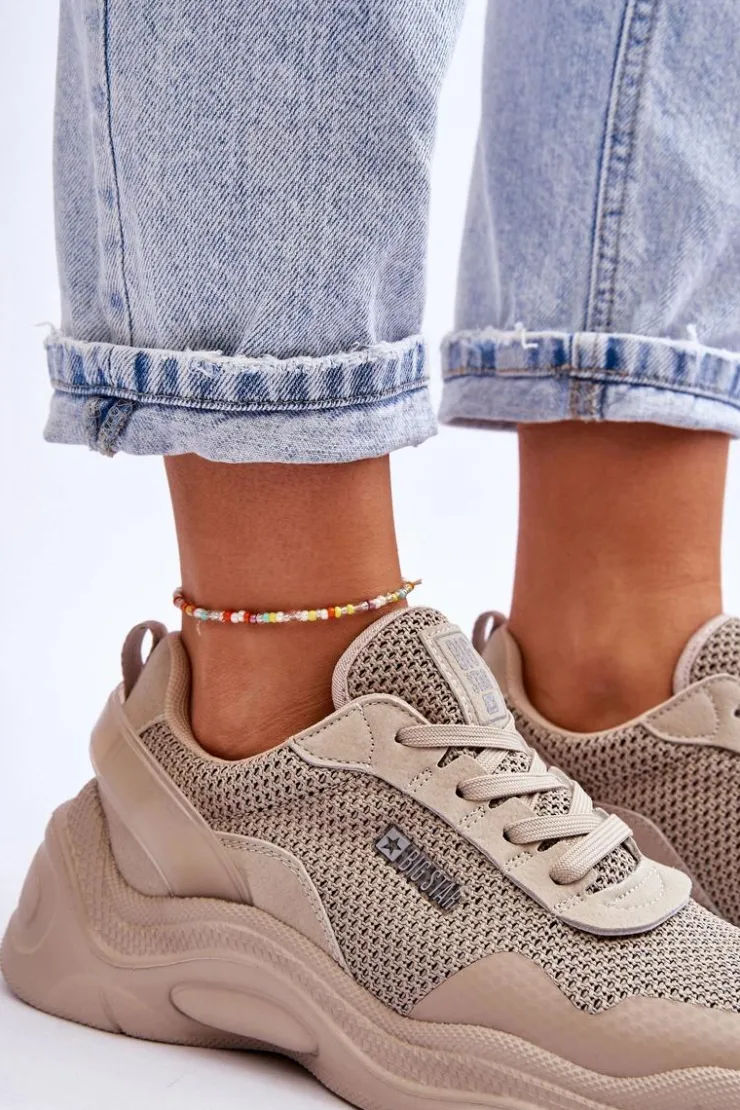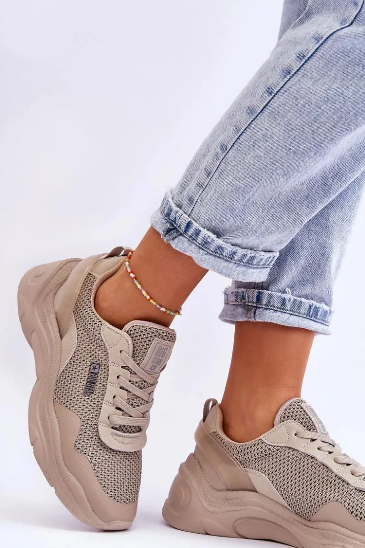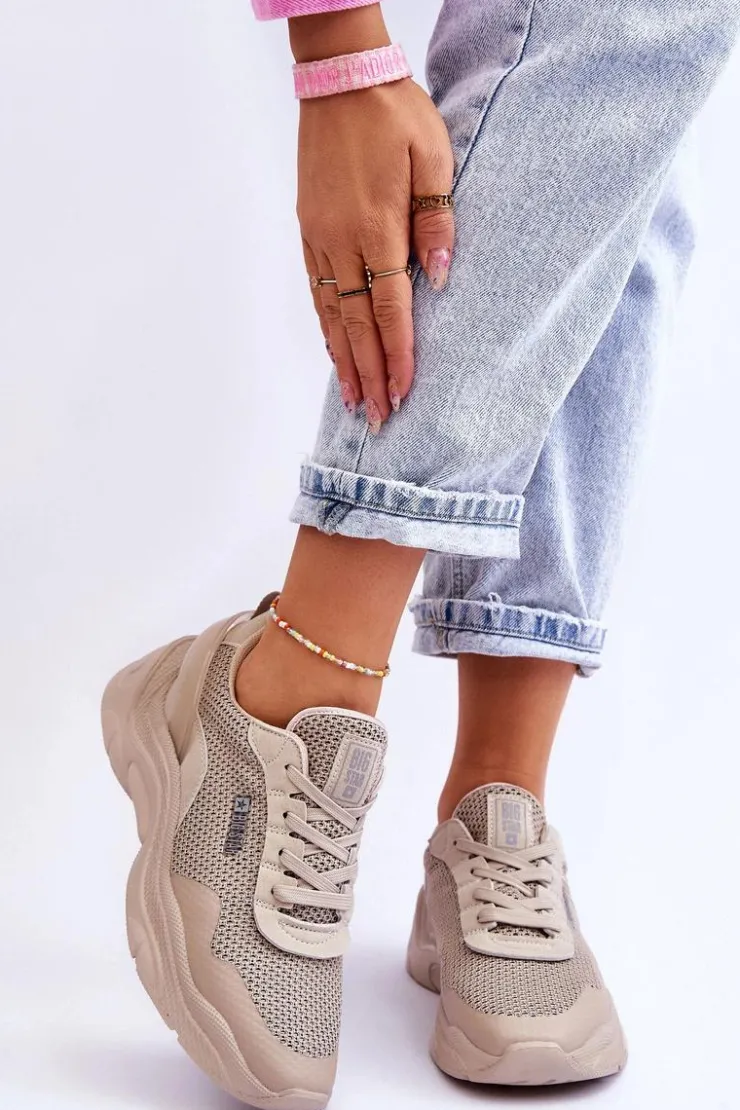 Damskie sneakersy marki Big Star zostały wykonane z połączenia tkaniny oraz eko skóry. Buty posiadają także wzmocniony zapiętek. Sneakersy posiadają wkładkę Memory Foam System, która zapamiętuje kształt stopy, zapewnia doskonałe dopasowanie, absorbuje wstrząsy, jest odporna na odkształcenia oraz pozwala na odparowanie wilgoci i regulację temperatury. Buty zostały osadzone na platformie i płaskim obcasie. Przy wyborze rozmiaru prosimy sugerować się tabelą rozmiarów.