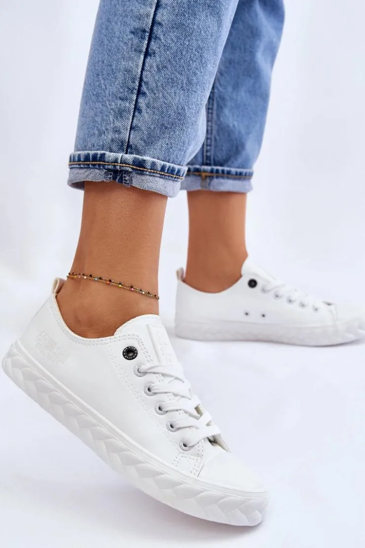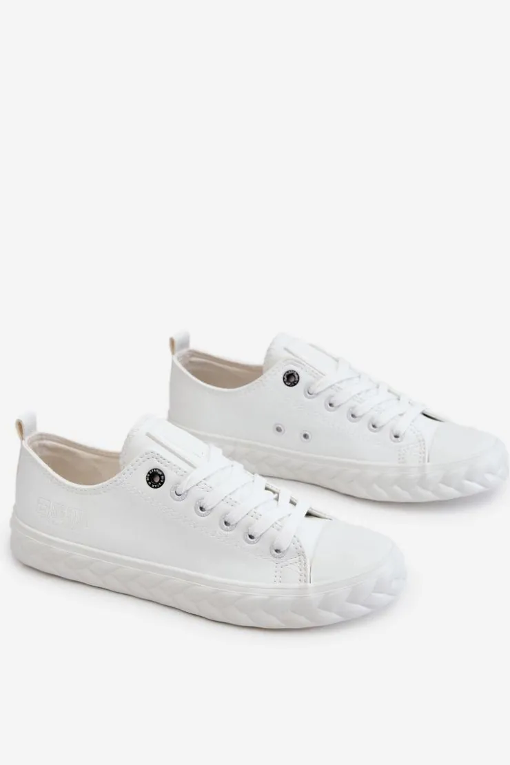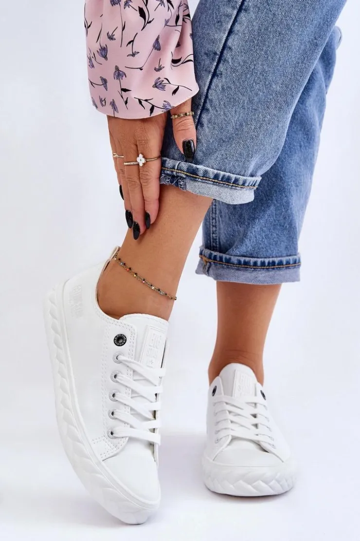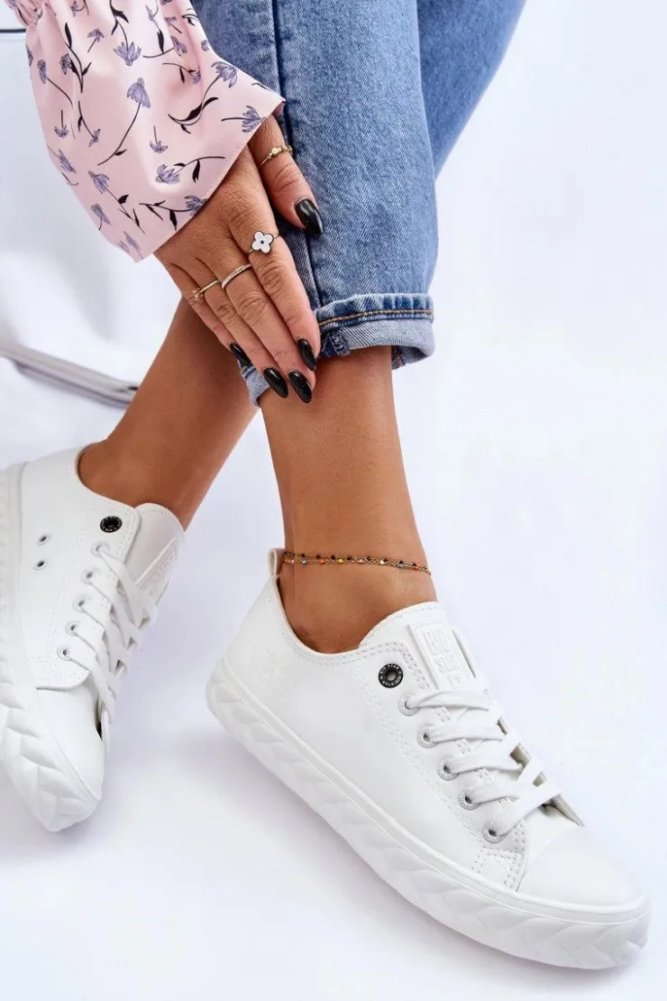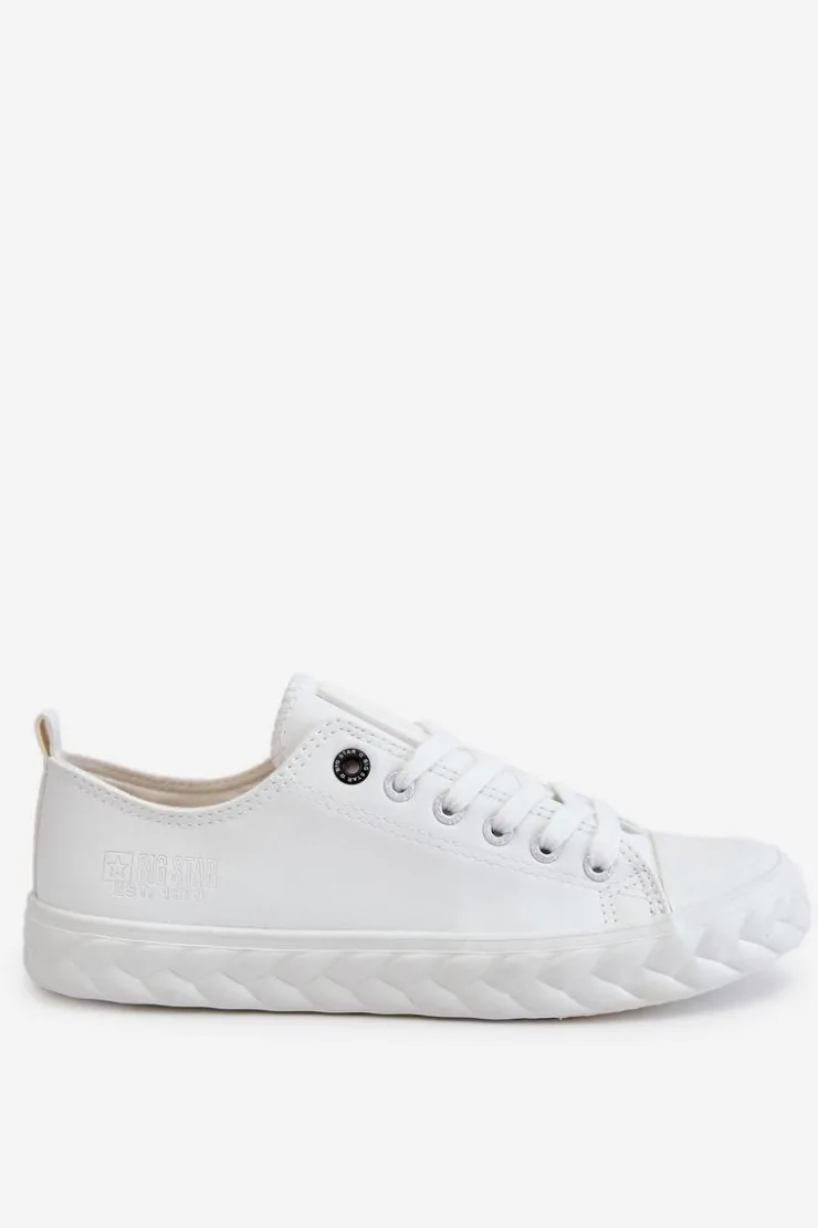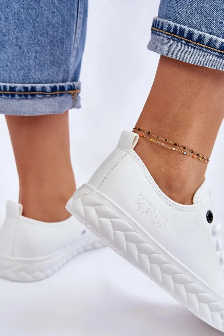 Niskie, damskie trampki marki Big Star. Cholewka została wykonana z materiałów syntetycznych pochodzących z recyklingu. Buty posiadają zaokrąglony, wzmocniony nosek oraz usztywniany zapiętek. Model ten posiada sznurowanie pozwalające na odpowiednie dopasowanie obuwia do tęgości nogi. Dodatkowo tenisówki posiadają antypoślizgową, gumową podeszwę. Zostały osadzone na platformie z ozdobnym warkoczem. Przy wyborze rozmiaru prosimy sugerować się tabelą rozmiarów.