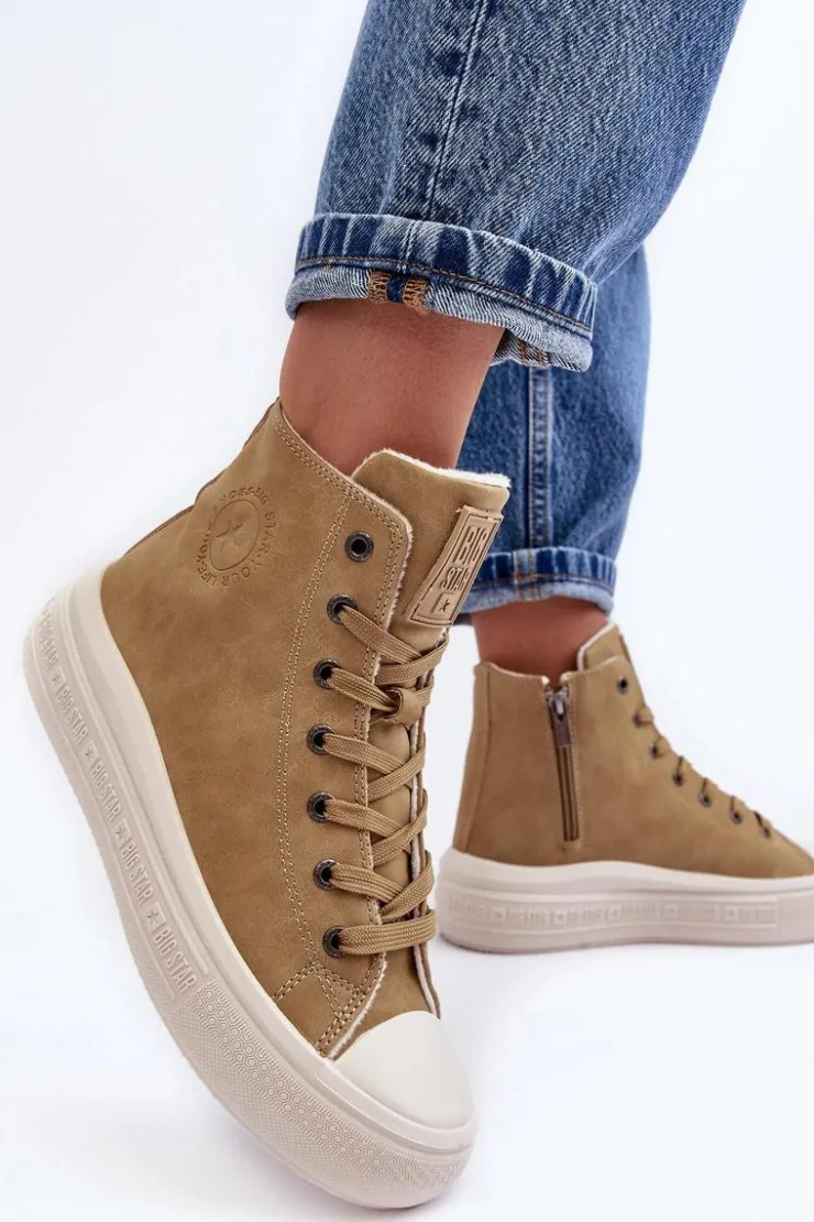 Damskie trampki od marki BIG STAR osadzone na platformie z gumowego tworzywa. Wykonane z eko skóry. Zapinane na suwak oraz dodatkowo posiadają sznurówki. Środek ocieplony futerkiem. Zapiętek jest usztywniony. Cholewka za kostkę. Koniecznie sprawdź całą naszą kolekcję butów marki BIG STAR. Przy wyborze rozmiaru prosimy sugerować się tabelą rozmiarów.