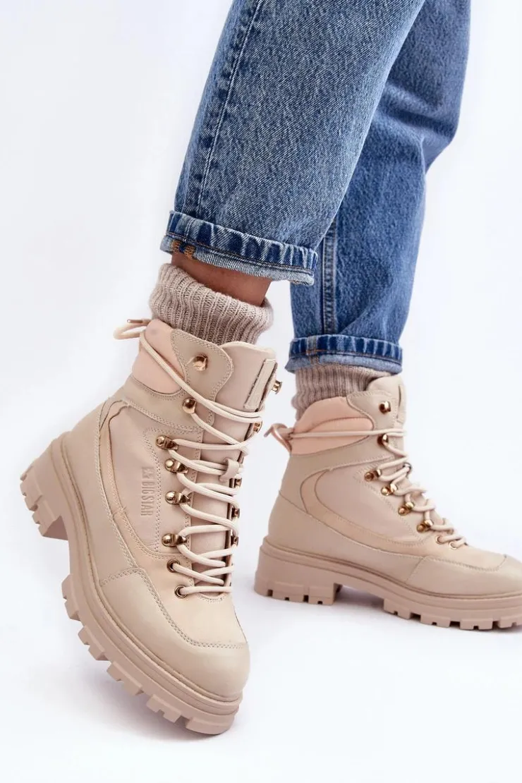 Damskie botki — trapery marki Big Star zostały wykonane z eko skóry. Osadzone na płaskim obcasie oraz platformie z gumowego tworzywa. Model klasycznie sznurowany. Środek ocieplony kocem obuwniczym. Zapiętek jest usztywniony. Noski zaokrąglone. Przy wyborze rozmiaru prosimy sugerować się tabelą rozmiarów.