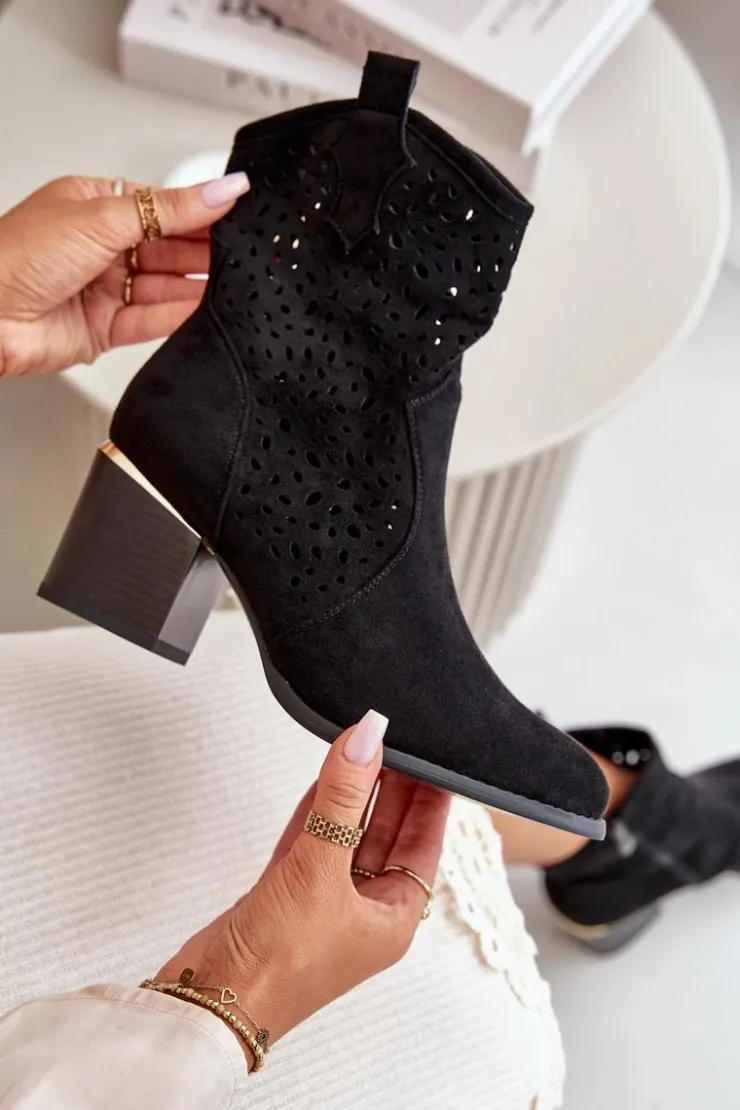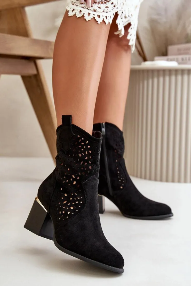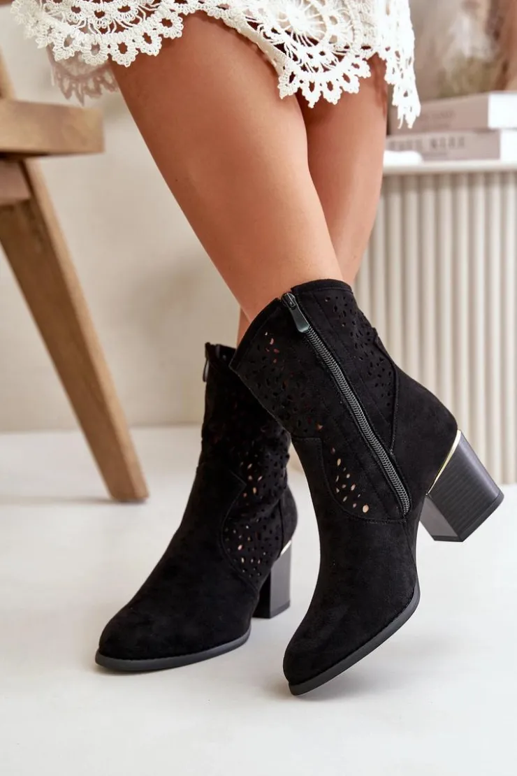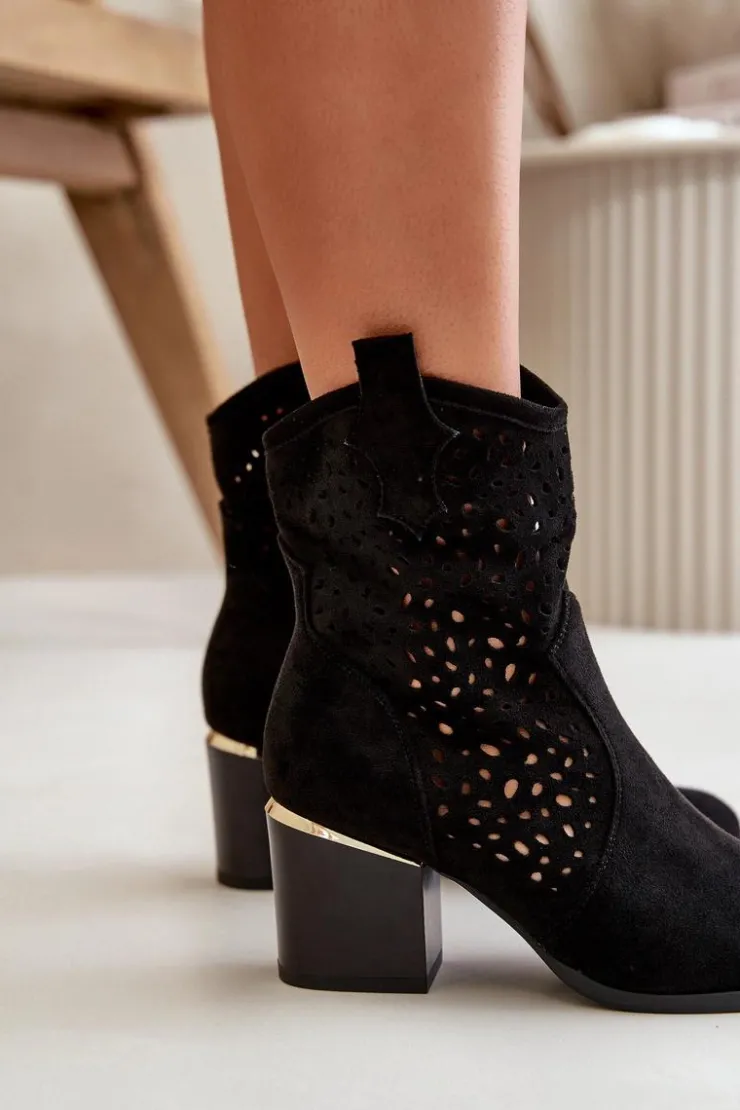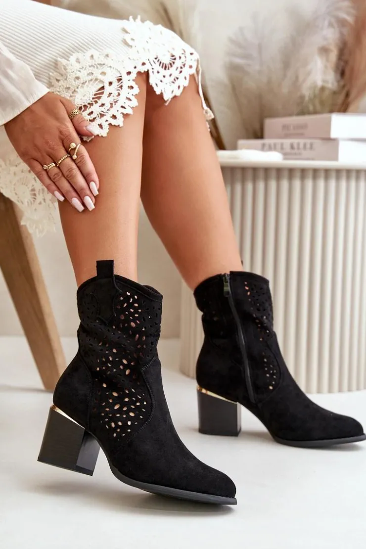 Damskie botki wykonane z eko zamszu, wyróżniają się ażurową cholewką, która sięga za kostkę. Osadzone na eleganckim słupkowym obcasie, ozdobionym złotym elementem, co dodaje im wyjątkowego charakteru. Zapinane na zamek, zapewniają wygodę użytkowania. Noski zaokrąglone, co podkreśla ich klasyczny i stylowy wygląd. Idealne do codziennych i eleganckich stylizacji. Przy wyborze rozmiaru prosimy sugerować się tabelą rozmiarów.
