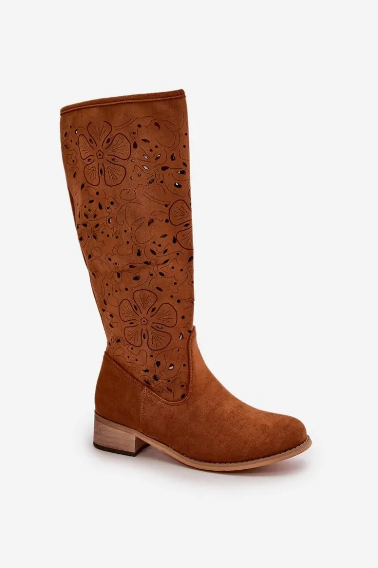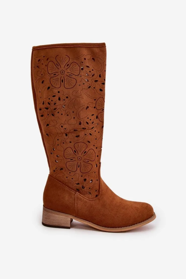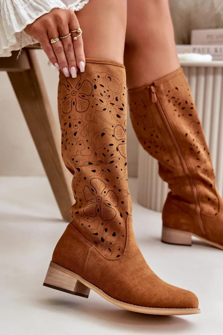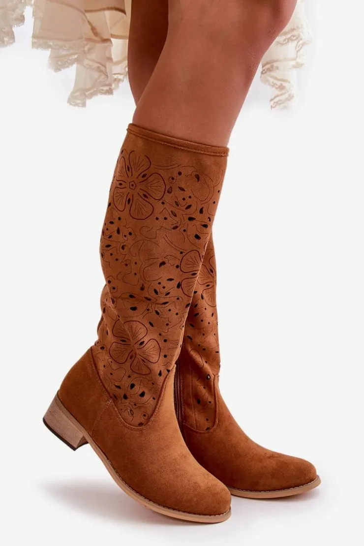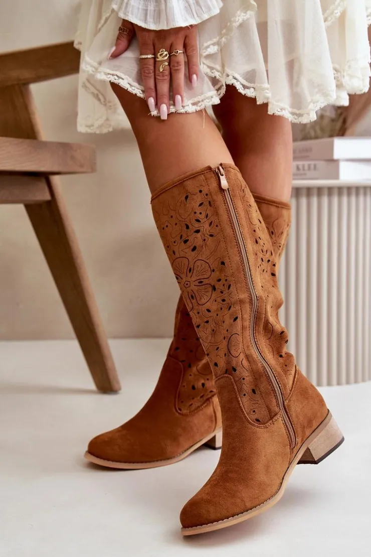 Kozaki damskie wykonane z wysokiej jakości eko zamszu. Cholewka sięga przed kolano, a jej ażurowy wzór dodaje wyjątkowego charakteru. Zapinane na zamek, co ułatwia zakładanie i zdejmowanie. Osadzone na niskim obcasie, który gwarantuje komfort noszenia przez cały dzień. Noski są zaokrąglone. Usztywniony zapiętek zapewnia dodatkowe wsparcie i stabilność. Te kozaki doskonale sprawdzą się zarówno w casualowych, jak i bardziej eleganckich stylizacjach. Przy wyborze rozmiaru prosimy kierować tabelą rozmiarów.