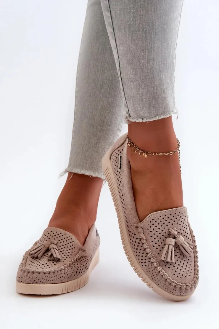 Mokasyny damskie wykonane z eko zamszu. Osadzone na platformie. Noski zaokrąglone. Przód ozdobiony małymi frędzlami. Model ten posiada miękką wkładkę ze skóry naturalnej, która zapewni wygodę podczas noszenia. Klasyczny fason, który dopasujesz do casualowych oraz eleganckich stylizacji. Przy wyborze rozmiaru prosimy sugerować się tabelą rozmiarów.