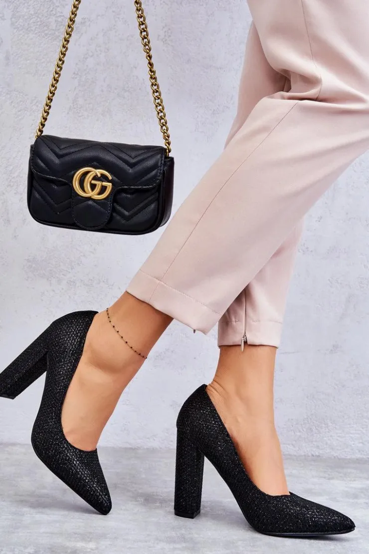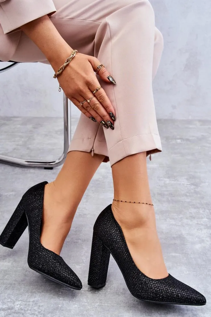 Klasyczne czółenka zostały wykonane z błyszczącego materiału o ciekawym splocie. Idealny model na różnego rodzaju imprezy czy okolicznościowe spotkania. Nosek w szpic oraz obcas w postaci słupka optycznie wysmukli nogi. Wkładka została wykonana z miękkiej eko skóry, co zwiększa komfort użytkowania obuwia. Przy wyborze rozmiaru prosimy sugerować się tabelą rozmiarów.