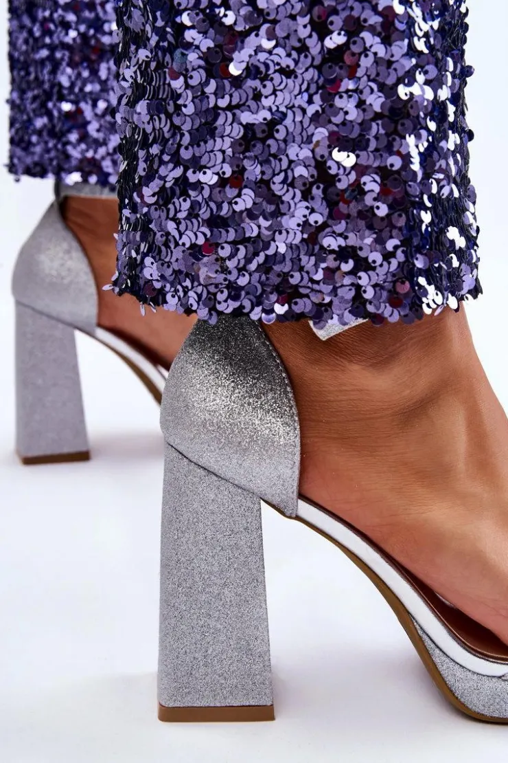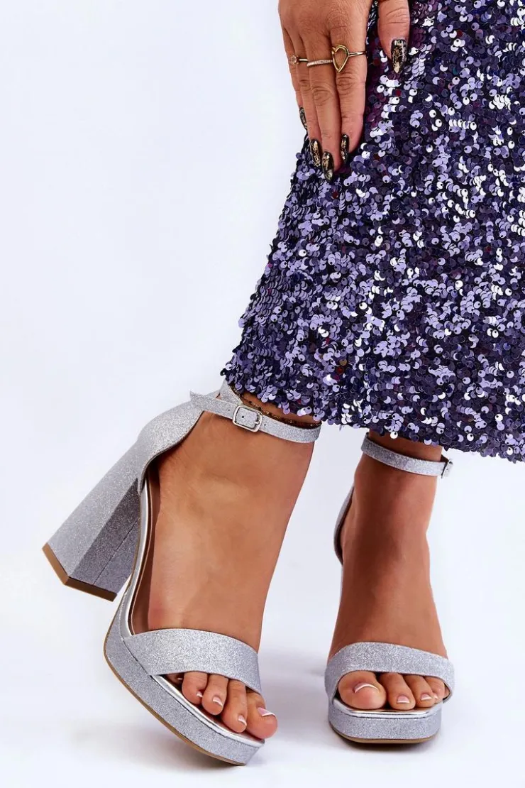 Piękne sandałki z mieniącymi się drobinkami idealnie sprawdzą się na imprezę! Posiadają z przodu paseczek przytrzymujący stopę oraz usztywniany zapiętek. Zapinane na regulowany pasek ze sprzączką. Delikatna platforma oraz masywny obcas w kształcie kwadratowego słupka. Miękka wkładka została wykonana z eko skóry. Przy wyborze rozmiaru prosimy kierować tabelą rozmiarów.