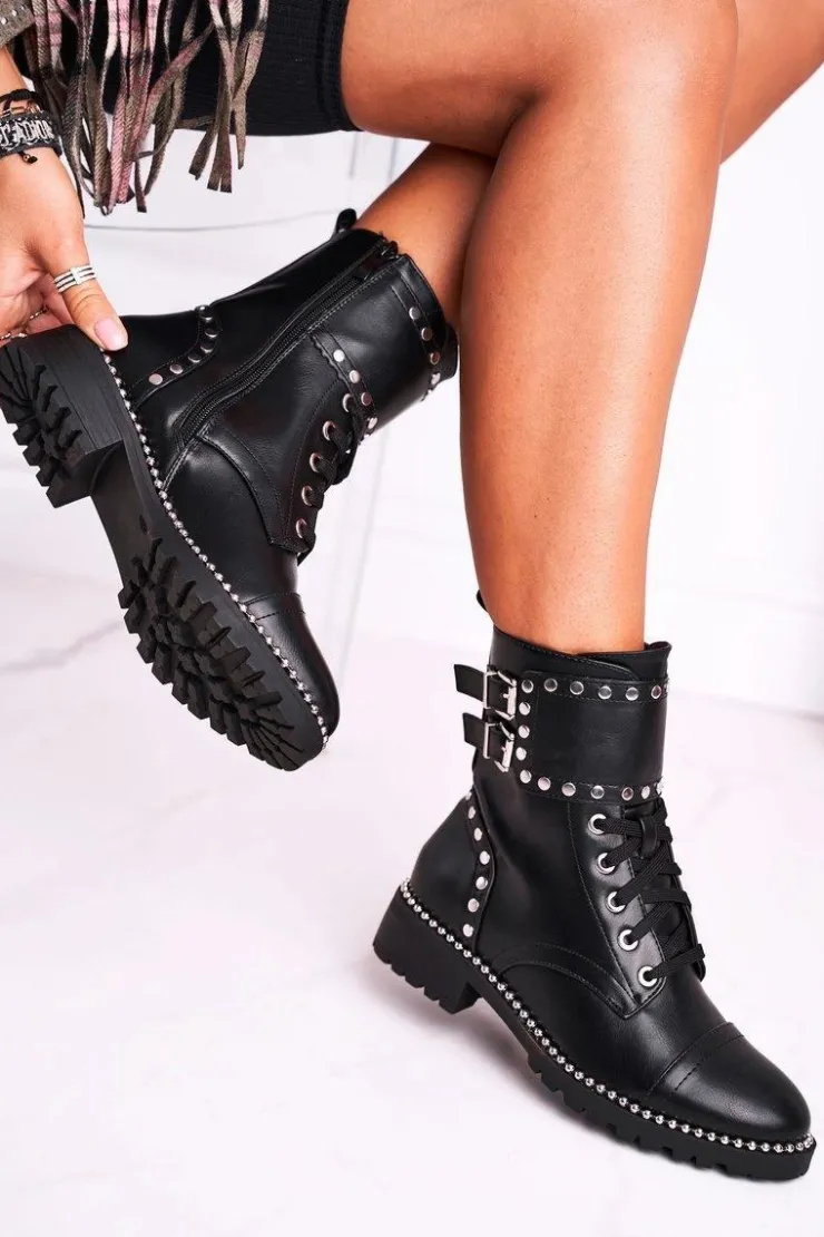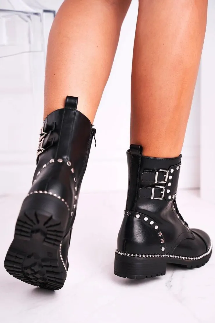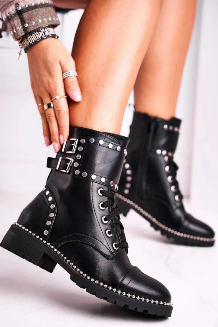 Damskie Boto Botki Damskie Ciepłe Srebrne Nity Czarne Freed