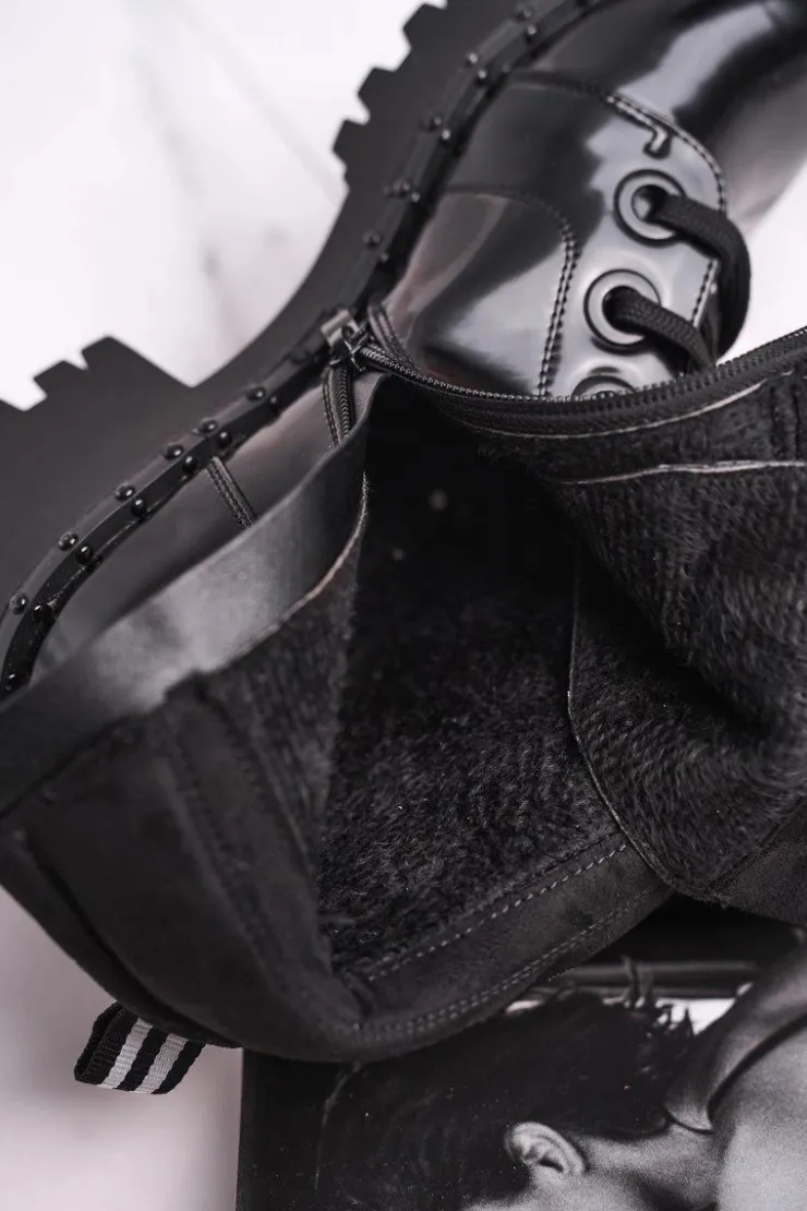 Czy może nas coś jeszcze zaskoczyć? Oczywiście! Spójrz na te przepiękne botki! Botki wykonane z lakierowanej matowej, skóry ekologicznej. Wewnątrz ocieplone kocem obuwniczym, więc o ciepło w chłodnie dni nie musisz się martwić. Masywna podeszwa z czarnymi nitami dookoła, wysoka cholewka – botki świetnie wpiszą się w stylizacje glam rock lub grunge. Proste zakładanie dzięki wszytemu na boku suwakowi. W zestawie znajdują się czarne oraz czerwone sznurowadła. Przy wyborze rozmiaru prosimy sugerować się tabelą rozmiarów.