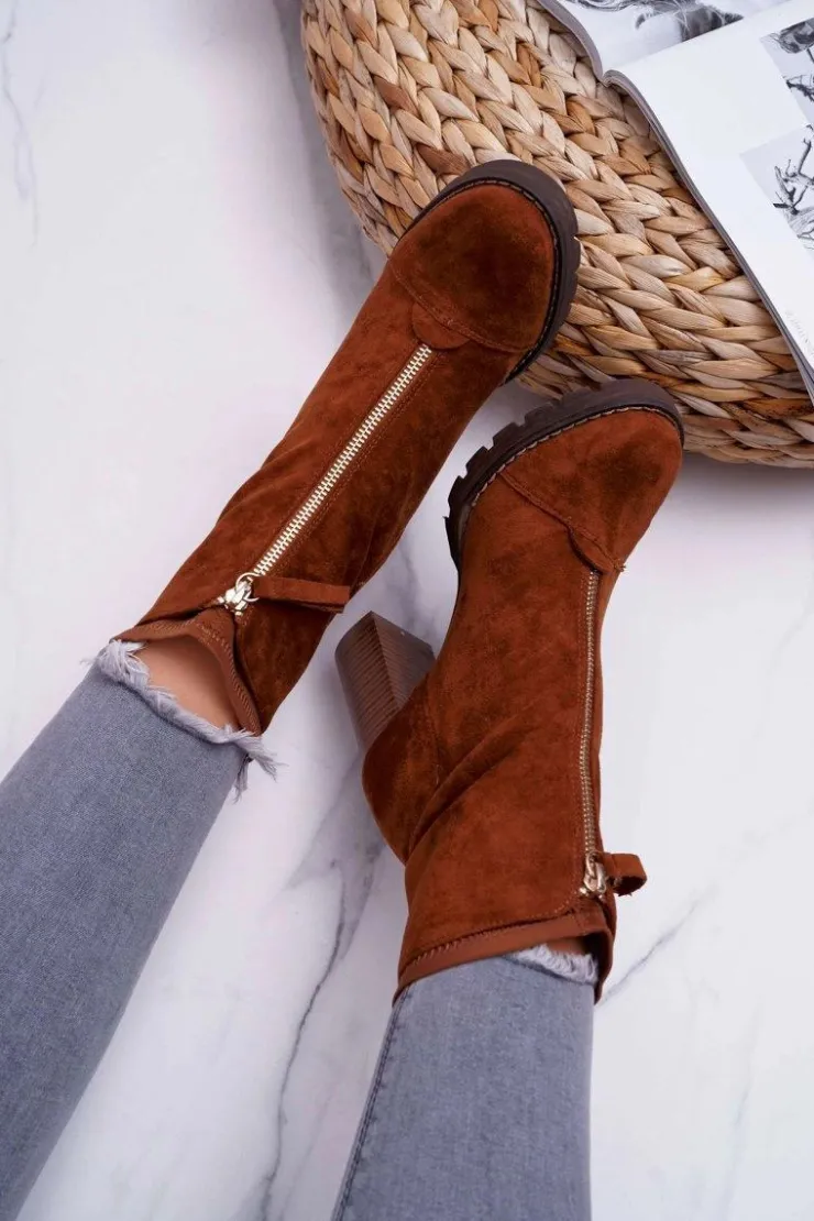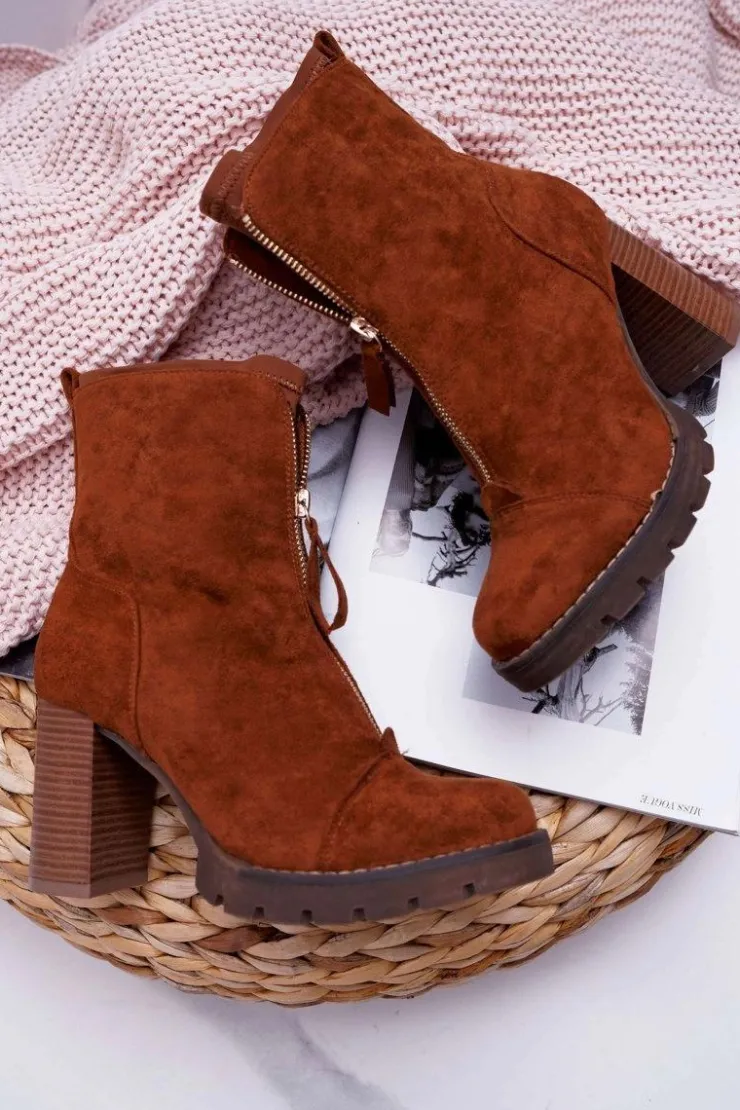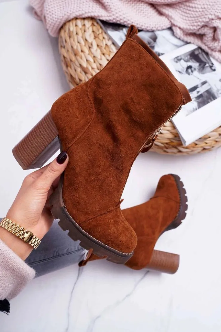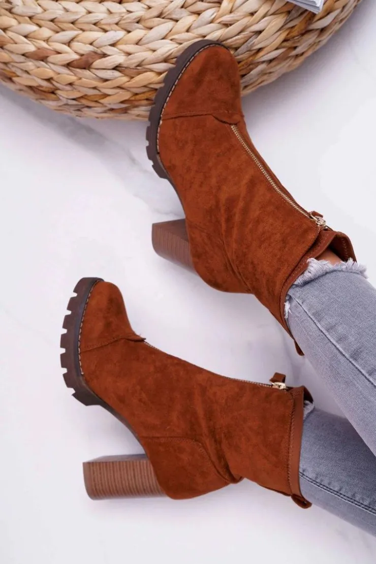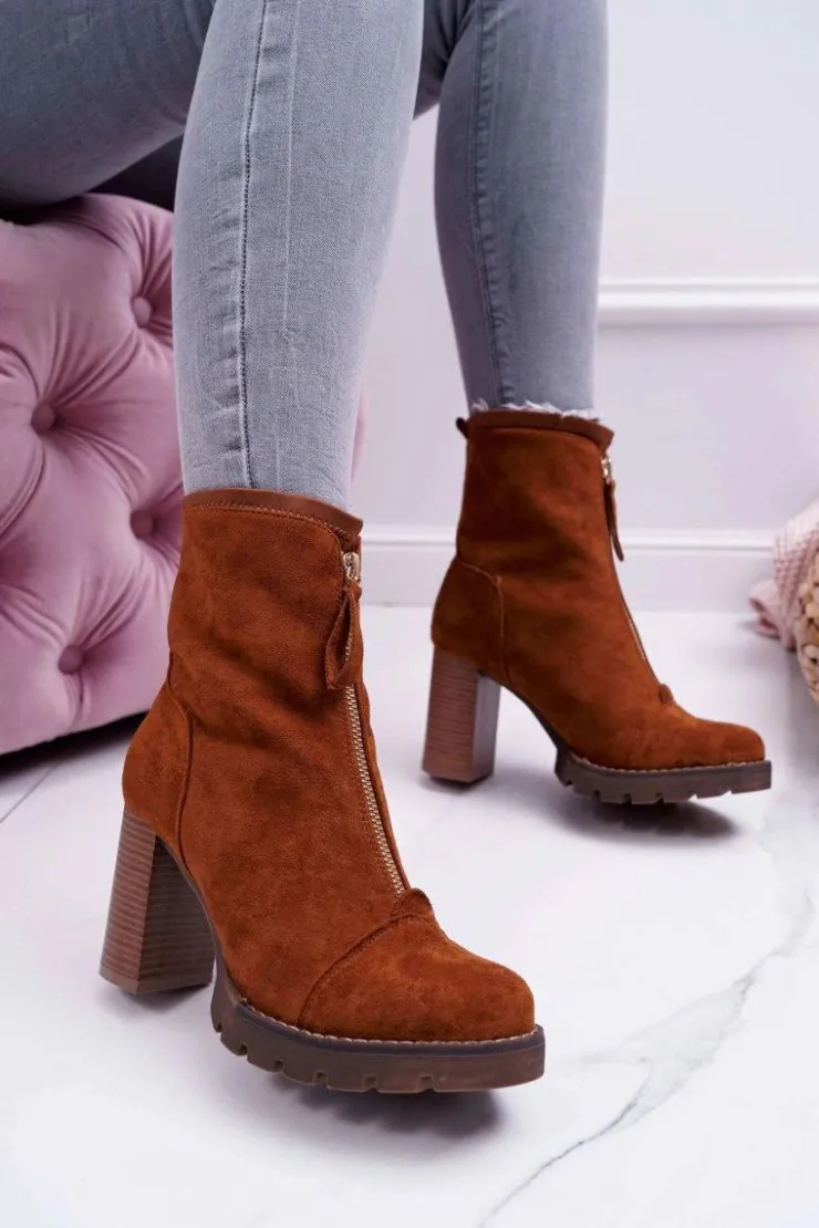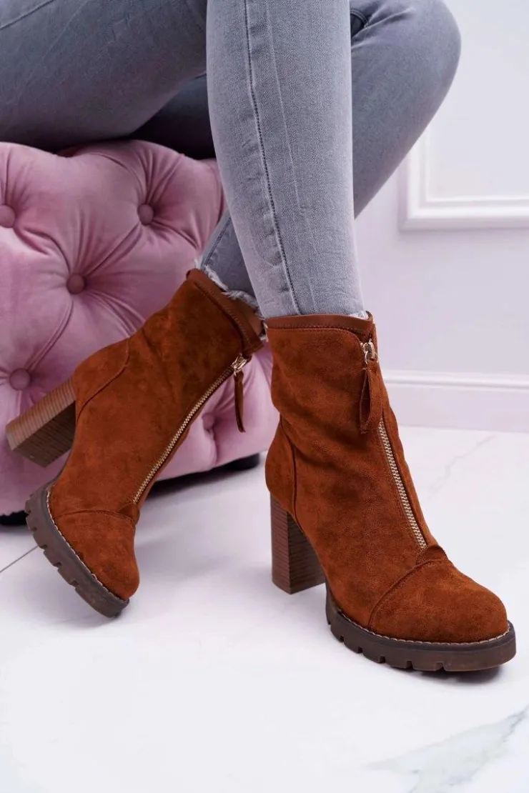 Botki na słupku wykonane z eko-zamszu z pewnością są i będą hitem stylizacji jeszcze przez długi czas! Nie może ich zabraknąć w Naszych stylizacjach. Zdobienie w postaci suwaka na przedniej części cholewki sprawia że nie można oderwać od nich oczu a dodatkowo ułatwi nam zakładanie. Przy wyborze rozmiaru prosimy sugerować się tabelą rozmiarów