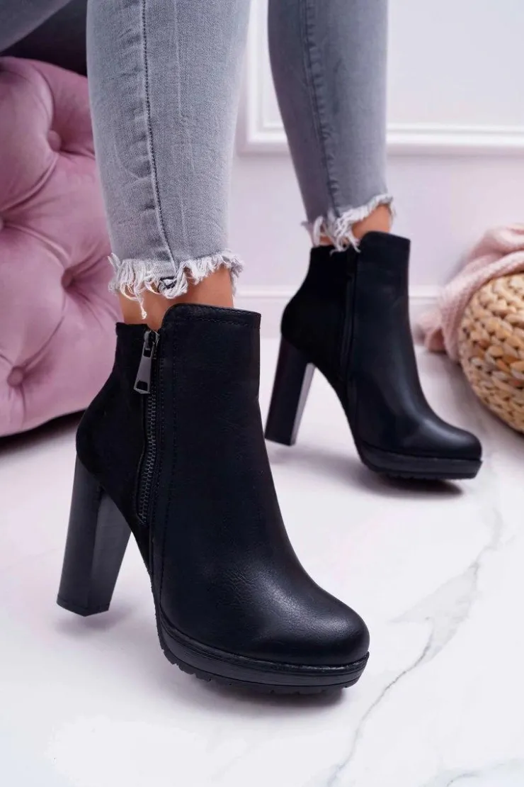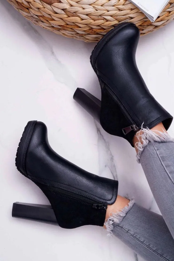 Botki na słupku wykonane z ekologicznej skóry oraz eko-zamszu, to połączenie z pewnością sprawi że stworzymy z nimi wiele wspaniałych stylizacji! Wnętrze pokryte kocem obuwniczym z krótkim włosiem, co zapewni nam komfort w każdych warunkach. Zdobienie w postaci suwaka na zewnętrznej części cholewki sprawia że nie można oderwać od nich oczu. Drugi suwak po wewnętrznej stronie ułatwi nam zakładanie. Przy wyborze rozmiaru prosimy sugerować się tabelą rozmiarów