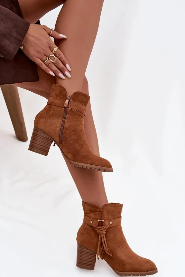 Botki damskie wykonane z eko zamszu. Klasyczny fason z zaokrąglonymi noskami został urozmaicony paskiem z frędzlami, nadającym butom oryginalności. Model osadzony na stabilnym obcasie typu słupek pięknie wysmukla sylwetkę, a jednocześnie zapewnia komfort podczas codziennego noszenia. Praktyczne zapięcie na zamek ułatwia zakładanie i zdejmowanie, dzięki czemu botki są wygodne w użytkowaniu. To obuwie, które doskonale sprawdzi się w sezonie jesienno-zimowym, stanowiąc stylowe dopełnienie zarówno casualowych, jak i bardziej eleganckich zestawów.