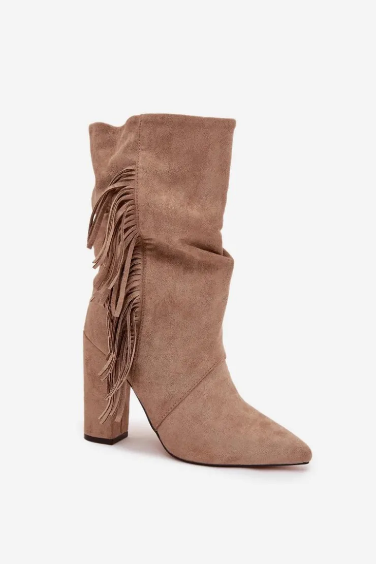Botki damskie na słupku z frędzlami i marszczeniem ocieplane czekoladowe Darlina