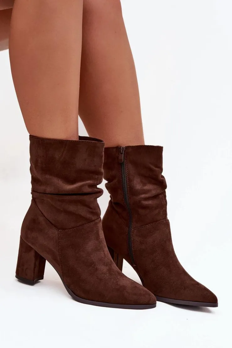 Botki damskie wykonane z eko zamszu to elegancka i modna propozycja na sezon jesienno-zimowy. Osadzone na stabilnym obcasie typu słupek pięknie wysmuklają sylwetkę, a szpiczaste noski dodają całości kobiecego charakteru. Marszczona cholewka nadaje stylowego, nowoczesnego wyglądu, a praktyczny zamek ułatwia zakładanie. Wnętrze ocieplone kocem obuwniczym zapewnia komfort i ciepło w chłodniejsze dni. To model, który doskonale sprawdzi się zarówno w codziennych, jak i eleganckich stylizacjach. Przy wyborze rozmiaru prosimy sugerować się tabelą rozmiarów.