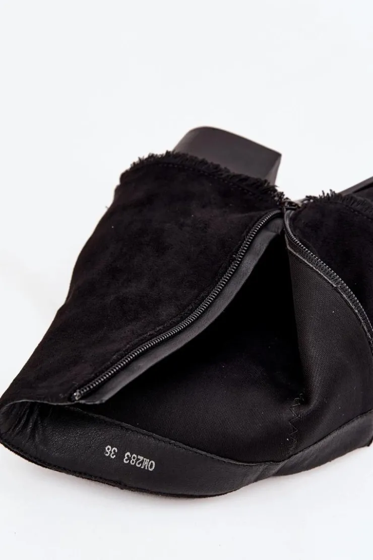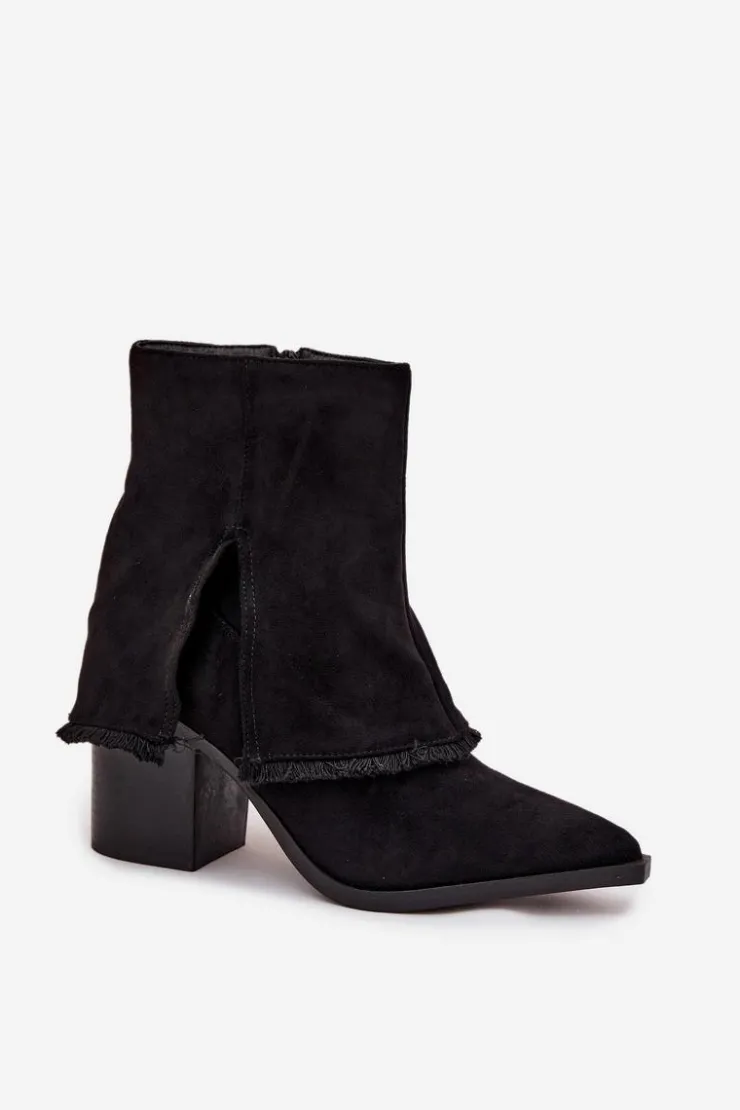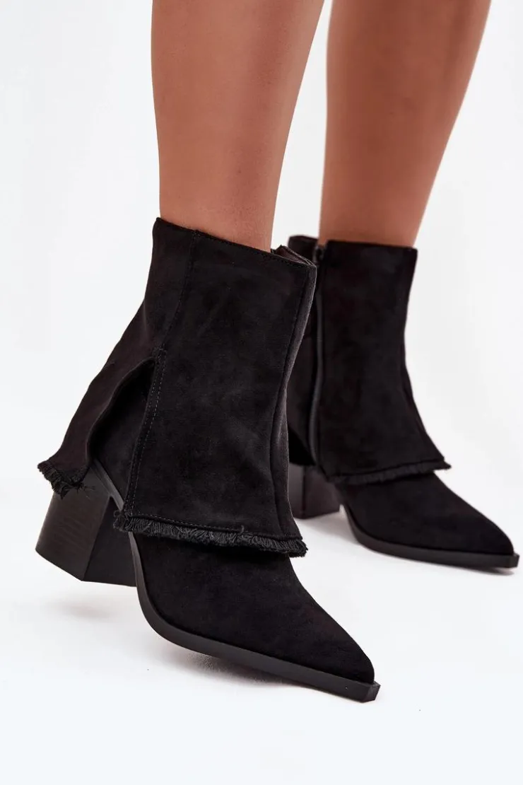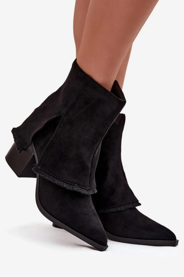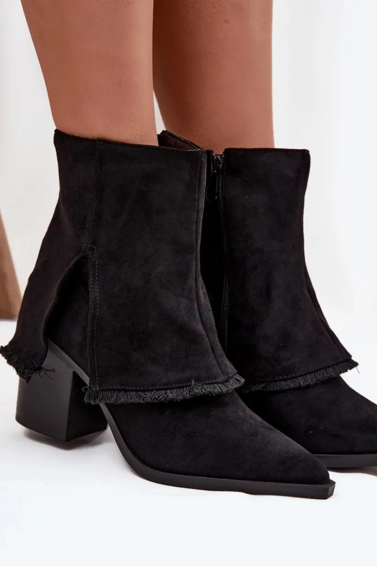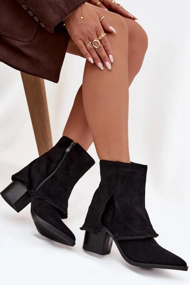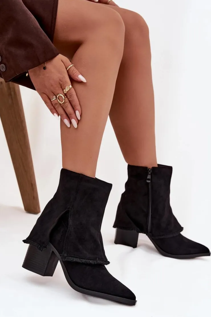 Botki damskie wykonane z eko zamszu. Model osadzony został na stabilnym obcasie typu słupek, który pięknie wysmukla sylwetkę i dodaje kilku centymetrów wzrostu, zachowując przy tym komfort noszenia. Charakterystycznym elementem jest wywinięta cholewka nachodząca na obcas, co nadaje wyjątkowego wyglądu i sprawia, że wyróżniają się na tle klasycznych fasonów. Szpiczaste noski dodatkowo podkreślają smukłą linię obuwia. Praktyczne zapięcie na zamek ułatwia zakładanie i zdejmowanie. To botki idealne dla kobiet, które szukają stylowego uzupełnienia jesienno-zimowych stylizacji – zarówno tych codziennych, jak i bardziej wyjściowych. Przy wyborze rozmiaru prosimy sugerować się tabelą rozmiarów.