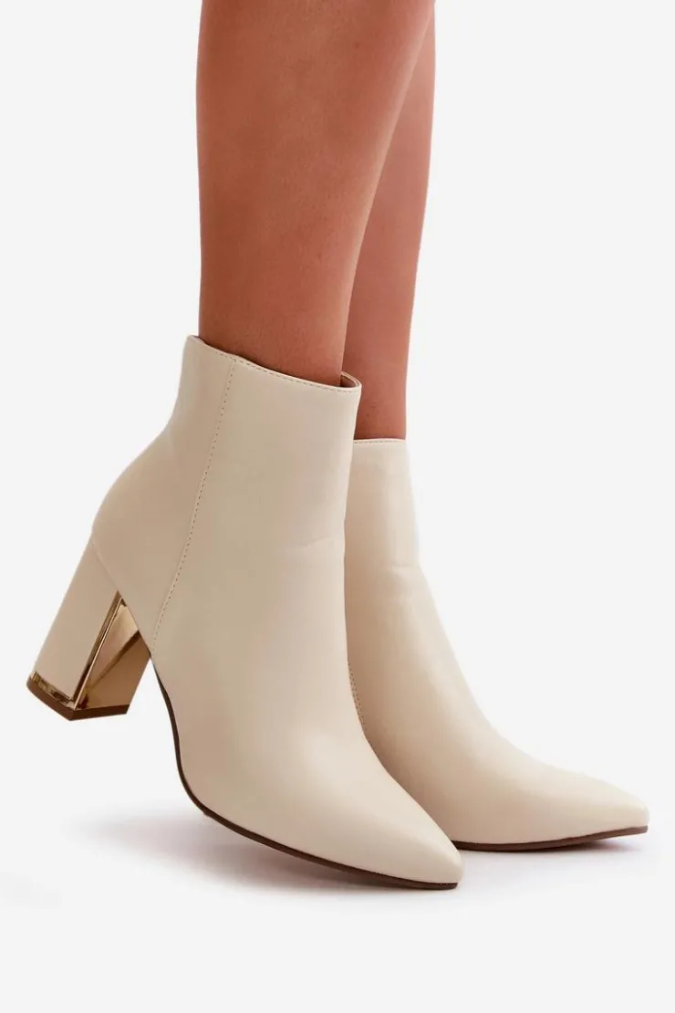 Damskie botki wykonane z eko skóry. Wnętrze jest ocieplane, co zapewnia ciepło i komfort w chłodniejsze dni. Noski w szpic nadają im stylowego charakteru, a obcas w formie stabilnego słupka jest dodatkowo ozdobiony lustrzanym elementem, co dodaje botkom wyjątkowego blasku i modnego akcentu. Koniecznie powinnaś je mieć w swojej jesienno-zimowej garderobie! Przy wyborze rozmiaru prosimy sugerować się tabelą rozmiarów.
