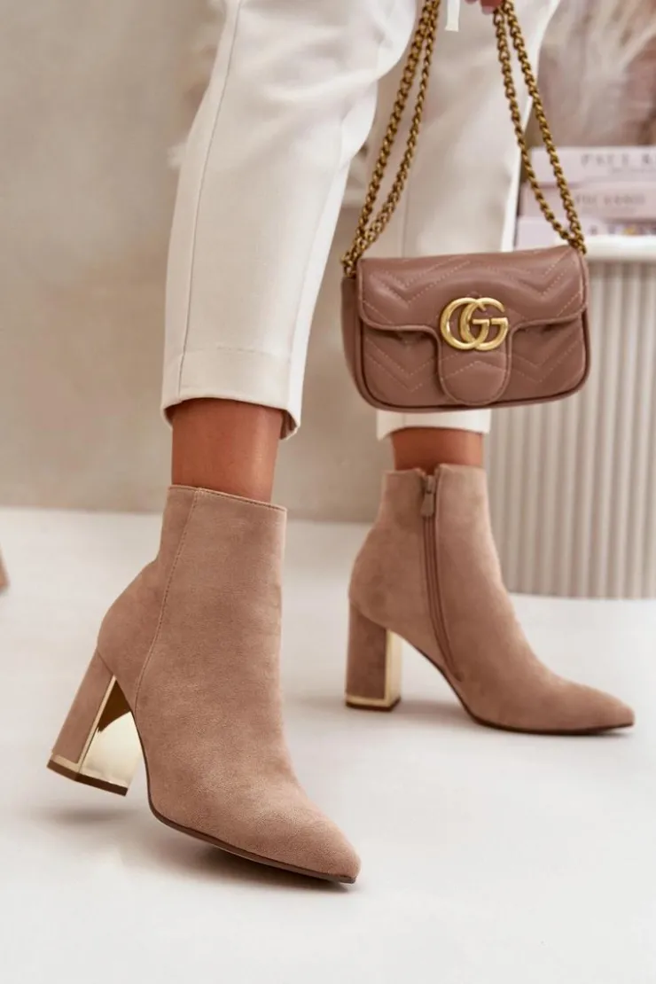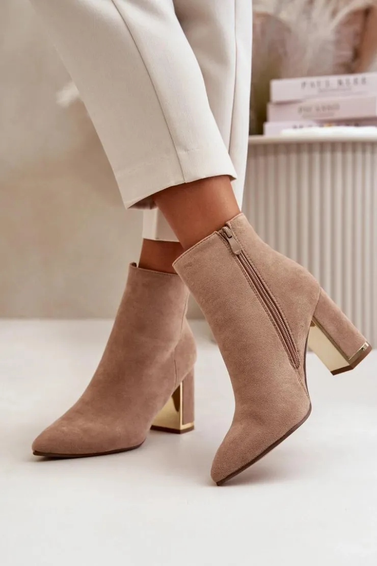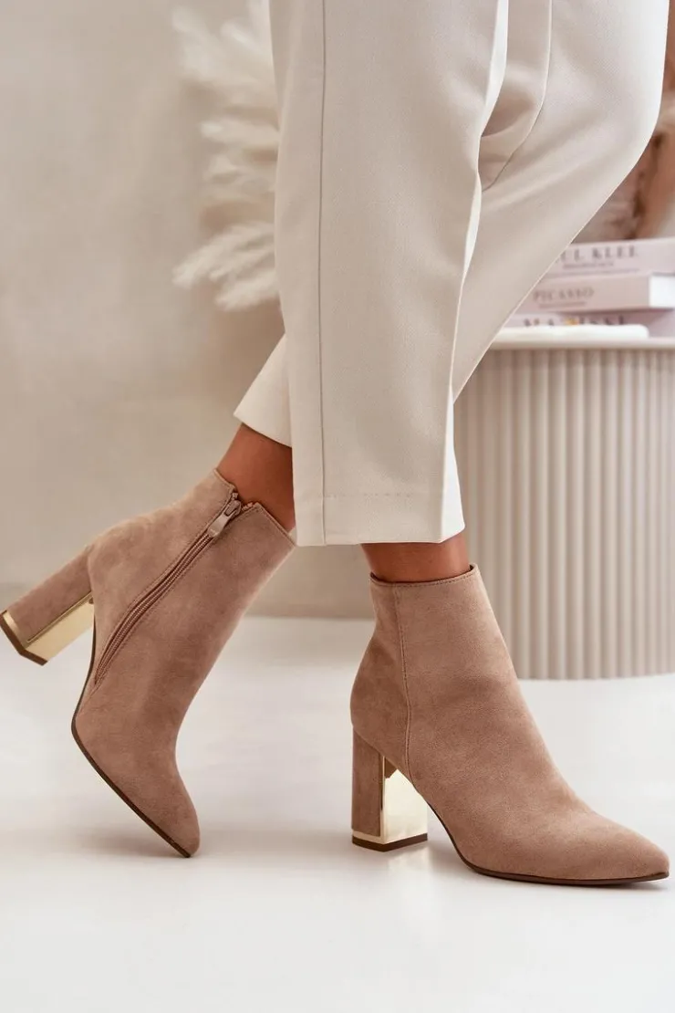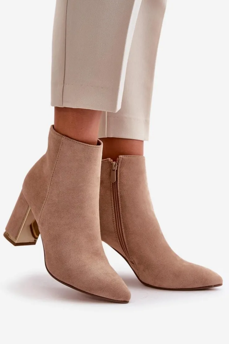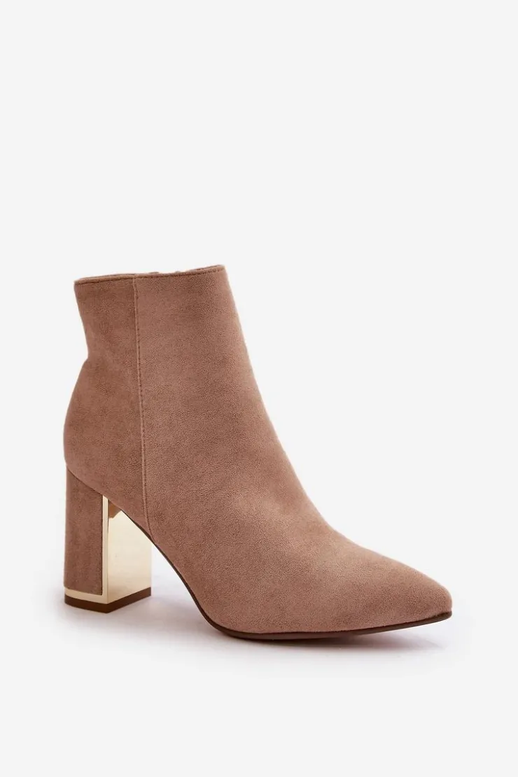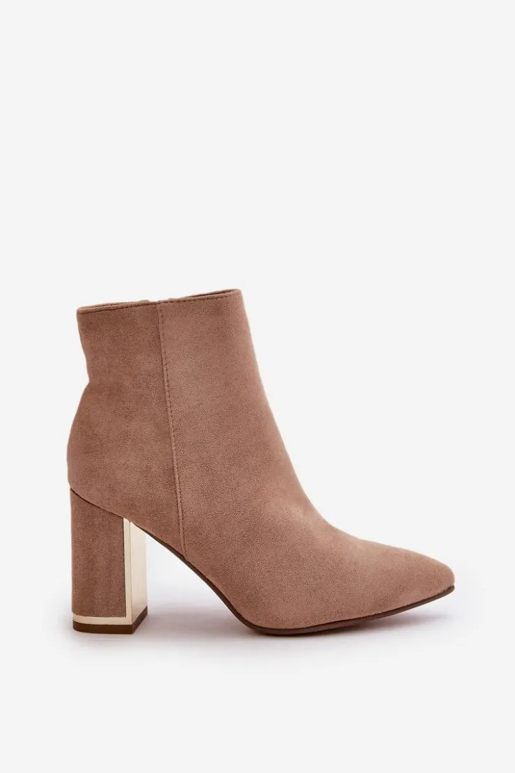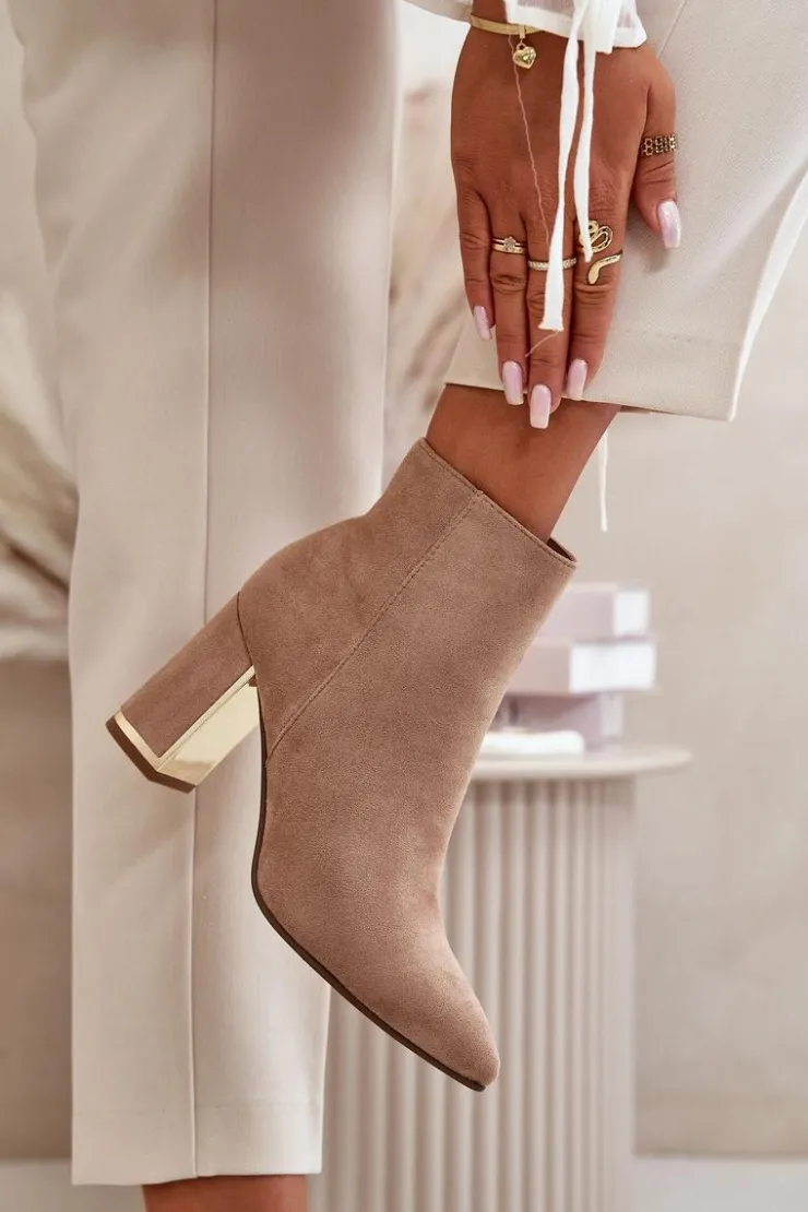 Damskie botki wykonane z eko zamszu, który jest przyjemny w dotyku i dodaje im eleganckiego wyglądu. Wnętrze botków jest ocieplane, co zapewnia ciepło i komfort w chłodniejsze dni. Noski w szpic nadają im stylowego charakteru, a obcas w formie stabilnego słupka jest dodatkowo ozdobiony lustrzanym elementem, co dodaje botkom wyjątkowego blasku i modnego akcentu. Koniecznie powinnaś je mieć w swojej jesienno-zimowej garderobie! Przy wyborze rozmiaru prosimy sugerować się tabelą rozmiarów.
