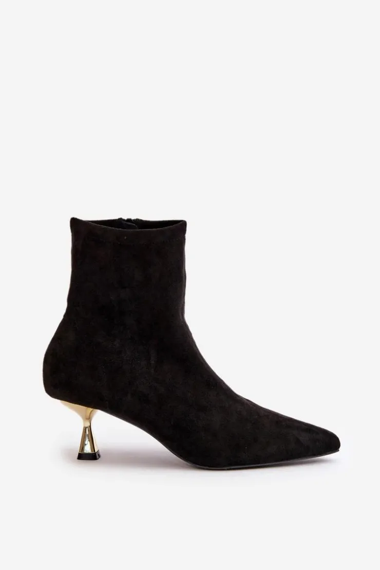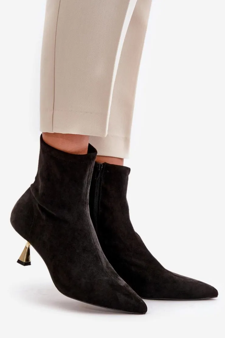 Stylowe botki damskie na ozdobnej szpilce to elegancki dodatek, który z pewnością przyciągnie spojrzenia. Wykonane z eko zamszu. Zapinane na zamek, który zapewnia wygodę i łatwość zakładania. Noski w szpic dodają wyrafinowanego charakteru, podkreślając kobiecość i smukłość sylwetki. Idealne na specjalne okazje, jak i do codziennych stylizacji, kiedy chcesz dodać sobie odrobinę elegancji. Przy wyborze rozmiaru prosimy sugerować się tabelą rozmiarów.