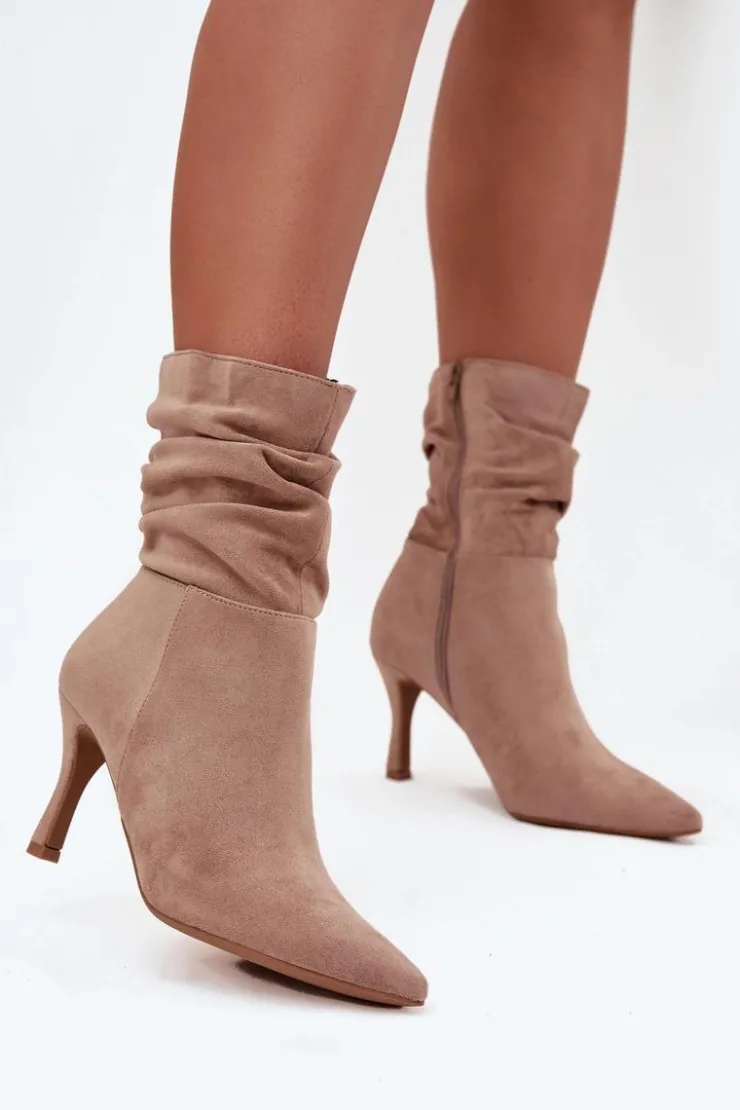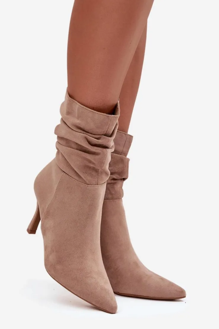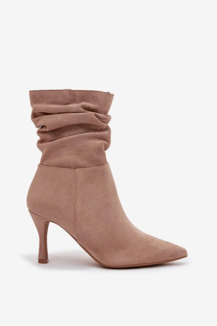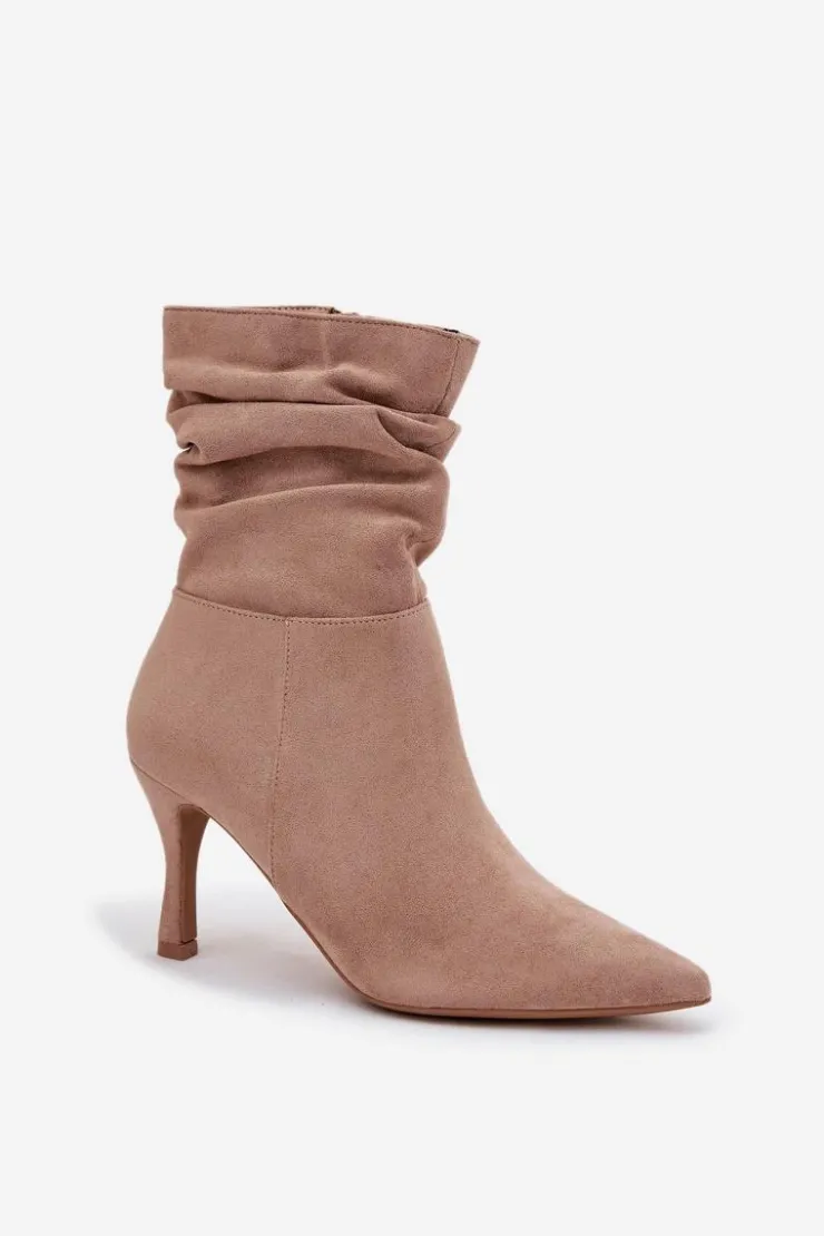 Eleganckie botki damskie z marszczoną cholewką to propozycja pełna kobiecego charakteru. Model ze szpiczastymi noskami i smukłą szpilką podkreśla nogi i dodaje stylu każdej stylizacji. Zamek z boku ułatwia szybkie zakładanie i idealne dopasowanie do stopy, czyniąc botki świetnym wyborem na wieczorne wyjścia i eleganckie okazje. Przy wyborze rozmiaru prosimy sugerować się tabelą rozmiarów.