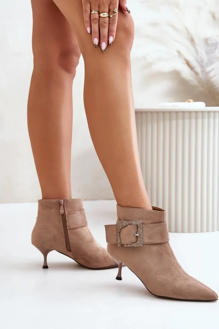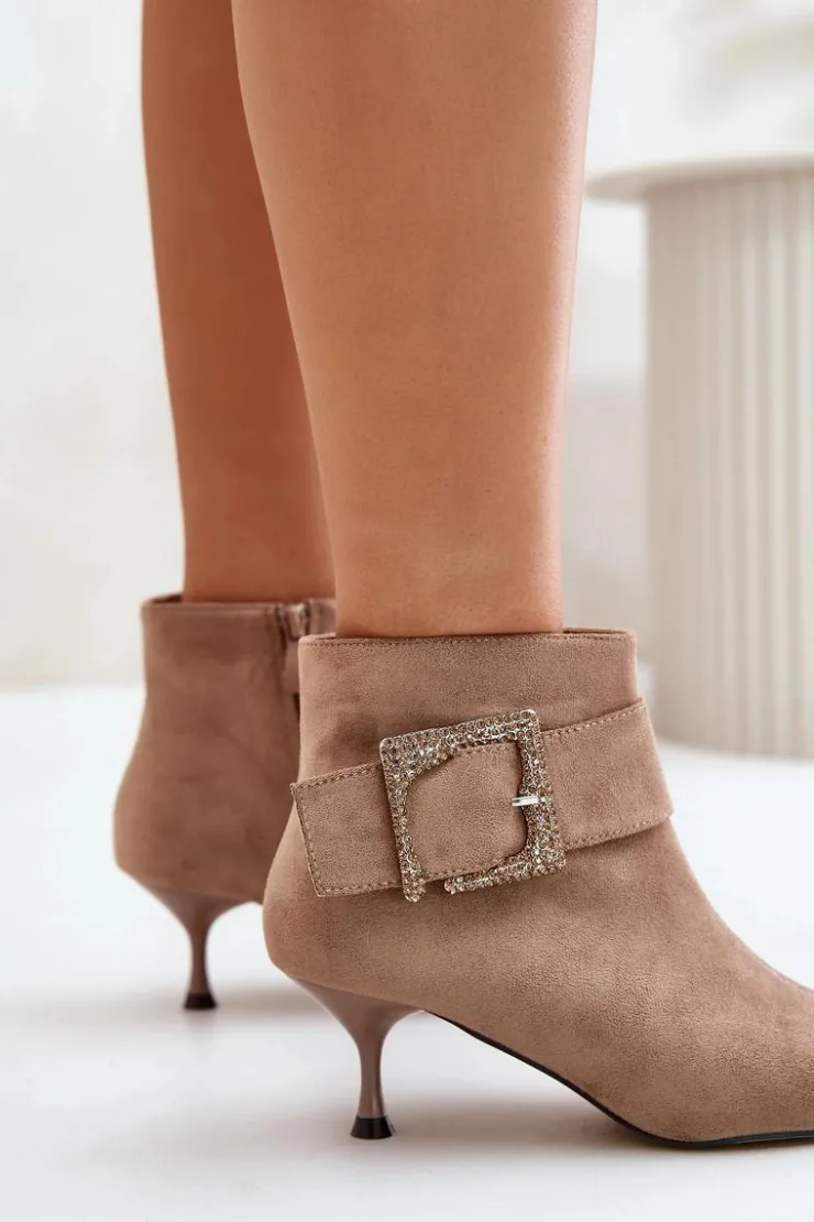 Stylowe botki na szpilce. Wykonane z eko zamszu. Zapinane na zamek, zapewniają wygodę i łatwość zakładania. Noski w szpic dodają wyrafinowanego charakteru, podkreślając kobiecość i smukłość sylwetki. Głównym atutem tego modelu jest duża, ozdobna klamra z boku cholewki. Idealne na specjalne okazje, jak i do codziennych stylizacji! Przy wyborze rozmiaru prosimy sugerować się tabelą rozmiarów.