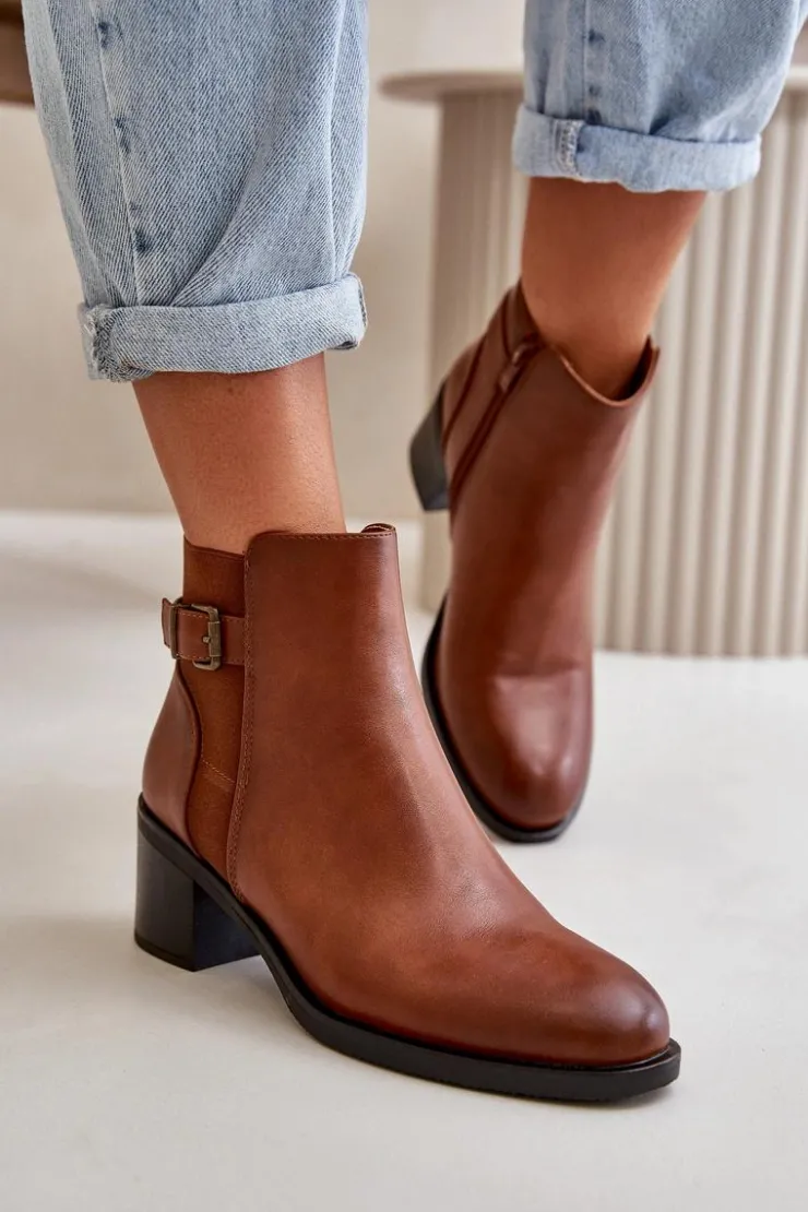 Botki damskie wykonane z eko skóry. Wnętrze ocieplone jest kocem obuwniczym, co zapewnia dodatkowe ciepło i komfort podczas chłodniejszych dni. Model zapinany na zamek, co ułatwia zakładanie i zdejmowanie, a także zapewnia doskonałe dopasowanie do stopy. Ozdobione detalem w postaci paseczka z klamrą. Idealne na jesienne i zimowe dni! Przy wyborze rozmiaru prosimy sugerować się tabelą rozmiarów.