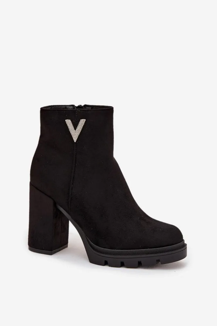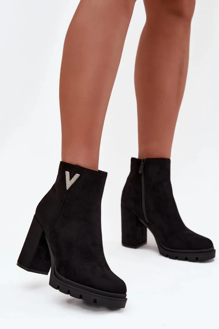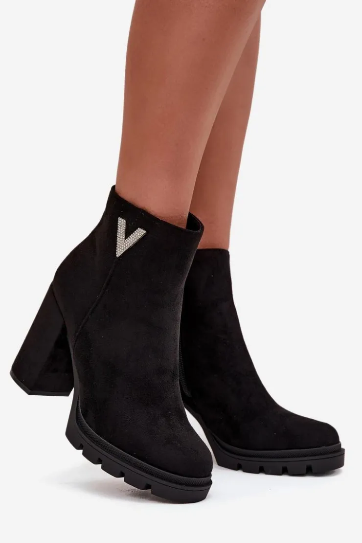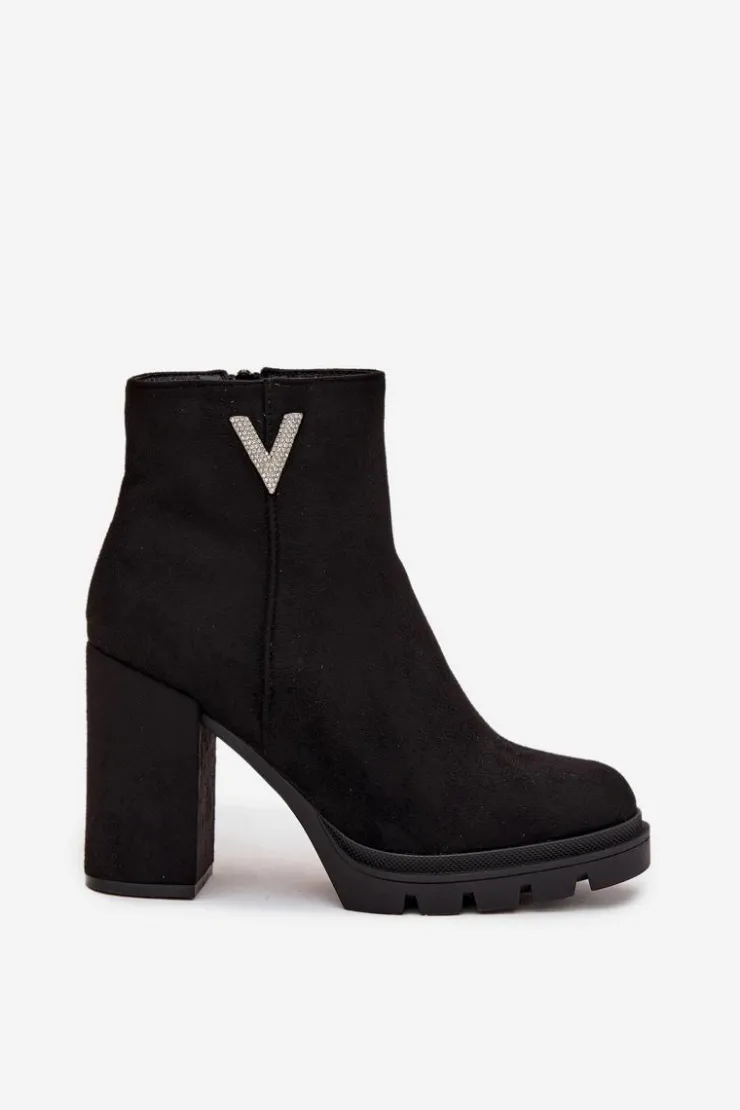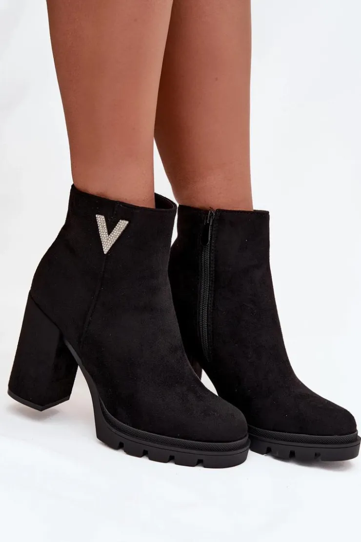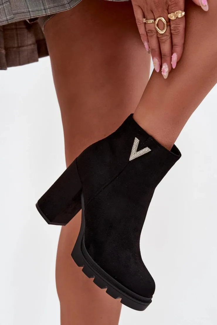 Botki damskie z eko zamszu to elegancka propozycja dla kobiet ceniących styl i wygodę. Osadzone na stabilnym obcasie typu słupek, zapewniają komfort noszenia i subtelnie podkreślają sylwetkę. Zaokrąglone noski nadają im klasycznego charakteru, a praktyczny zamek ułatwia zakładanie i zdejmowanie. Uwagę przyciąga błyszczący detal w kształcie litery V umieszczony z boku cholewki, który dodaje oryginalności i modnego akcentu. To model doskonały zarówno do codziennych, jak i eleganckich stylizacji.