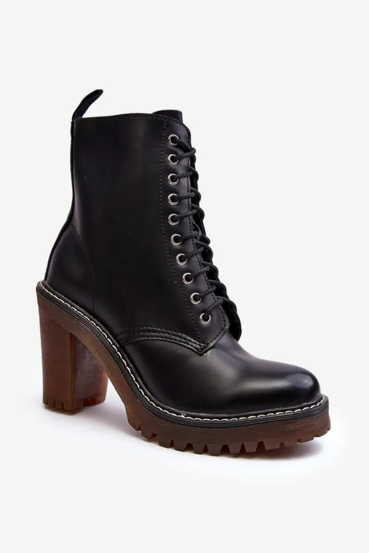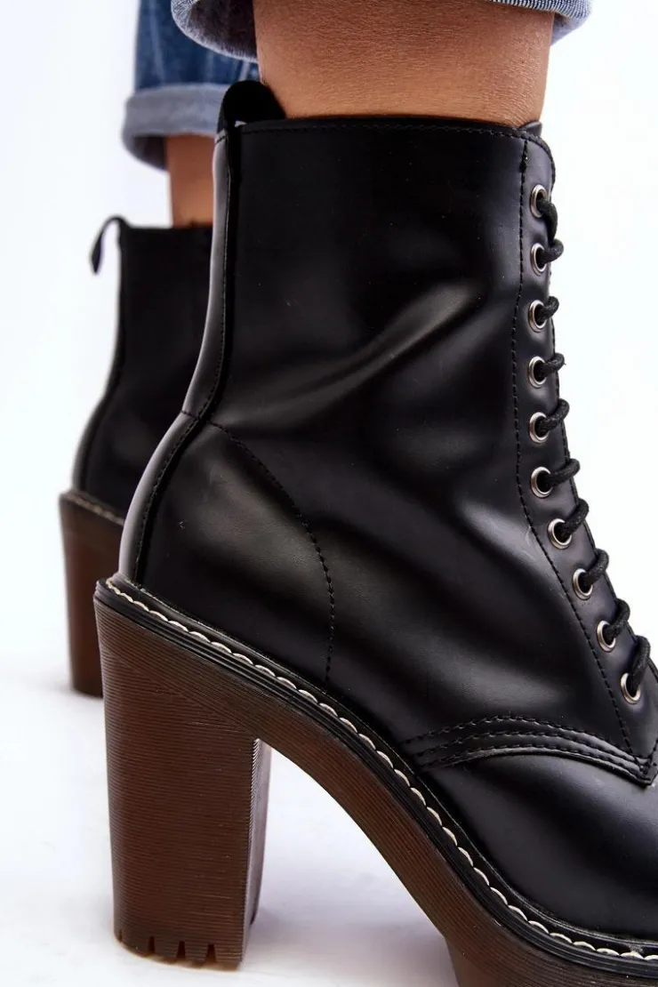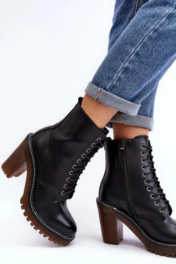 Botki damskie wykonane z eko skóry. Osadzone na obcasie w postaci słupka. Cholewka za kostkę. Model zapinany na suwak z boku oraz dodatkowo posiada sznurowanie. Wkładka ocieplona kocem obuwniczym. Noski zaokrąglone. Usztywniony zapiętek. Przy wyborze rozmiaru prosimy sugerować się tabelą rozmiarów.