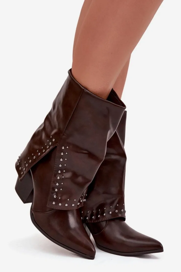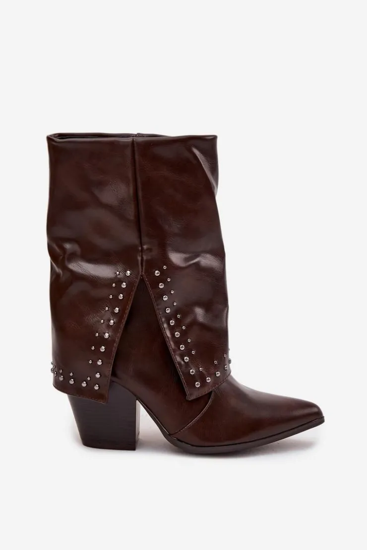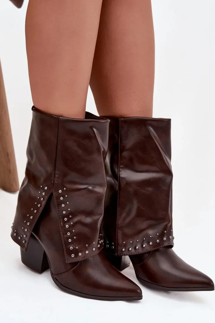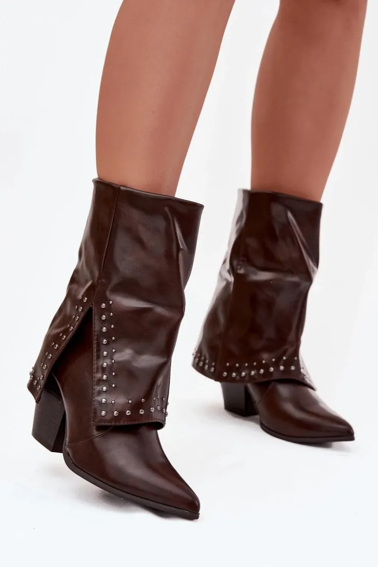 Botki damskie w stylu kowbojek, wykonane z eko skóry to modna propozycja na sezon jesienno-zimowy. Model osadzony został na stabilnym, ściętym obcasie typu słupek, który podkreśla charakter westernowego stylu. Wywinięta cholewka ze zdobieniem nadaje oryginalnego i stylowego wyglądu. Botki są wsuwane, a dodatkowy suwak ułatwia zakładanie i zdejmowanie. Wnętrze ocieplone pianką pokrytą tkaniną zapewnia komfort i ciepło w chłodniejsze dni. To wyjątkowy model, który łączy wygodę z ponadczasowym stylem – idealny zarówno do jeansów, jak i do sukienek w stylu boho.