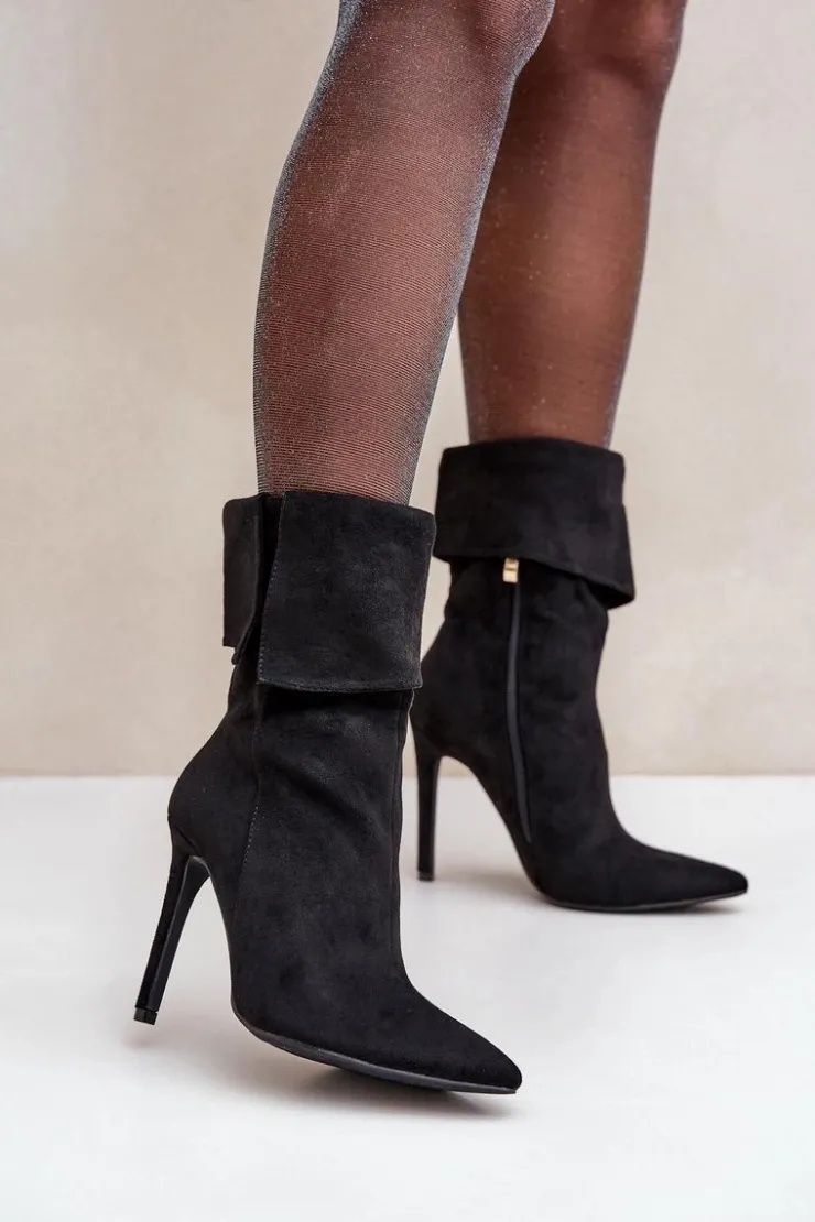 Eleganckie botki damskie wykonane z miękkiego eko zamszu. Osadzone na smukłej szpilce, która dodaje klasy i wydłuża sylwetkę. Góra cholewki wywinięta, co nadaje modelowi oryginalnego charakteru. Model wsuwany, dodatkowo posiada zapięcie na zamek. Szpiczaste noski. Idealne na wieczorne wyjścia oraz do formalnych stylizacji. Przy wyborze rozmiaru prosimy sugerować się tabelą rozmiarów.