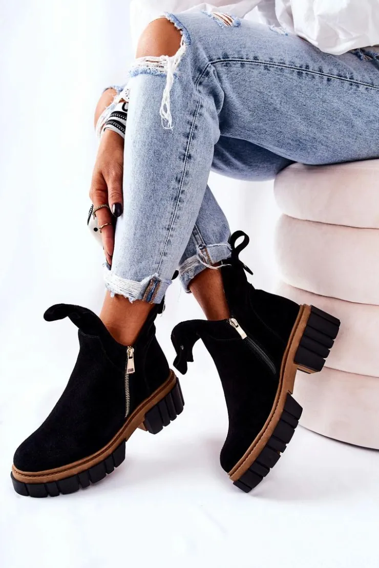 Botki z wycięciem wyglądają niezwykle modnie i stylowo. Wykonane zostały z naturalnego zamszu. Środek jest ocieplany kocem obuwniczym. Zapinane z obu stron na dwa suwaki. Botki będą pasować na wiele okazji. Podeszwa oraz masywny obcas zapewnią stabilność. Koniecznie musisz je mieć! Nie czekaj aż znikną!Przy wyborze rozmiaru prosimy sugerować się tabelą rozmiarów.