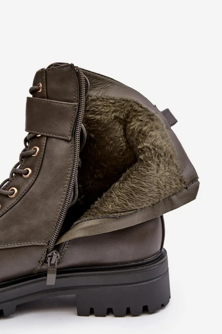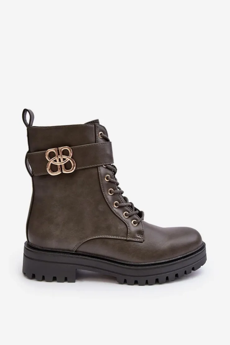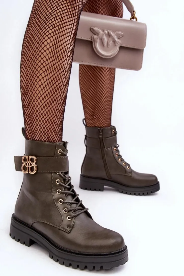 Botki damskie osadzone na płaskim, stabilnym obcasie. Z przodu sznurowane oraz dodatkowo zapinane suwakiem. Noski zaokrąglone. Wewnątrz ocieplone kocem obuwniczym. Na cholewce pasek ze złotą ozdobą. Dodatkowo zapiętek jest usztywniony. Przy wyborze rozmiaru prosimy sugerować się tabelą rozmiarów.