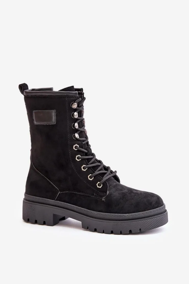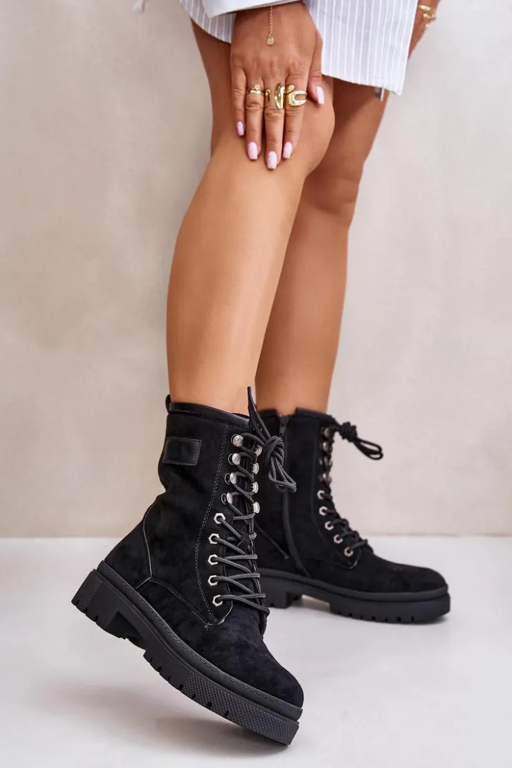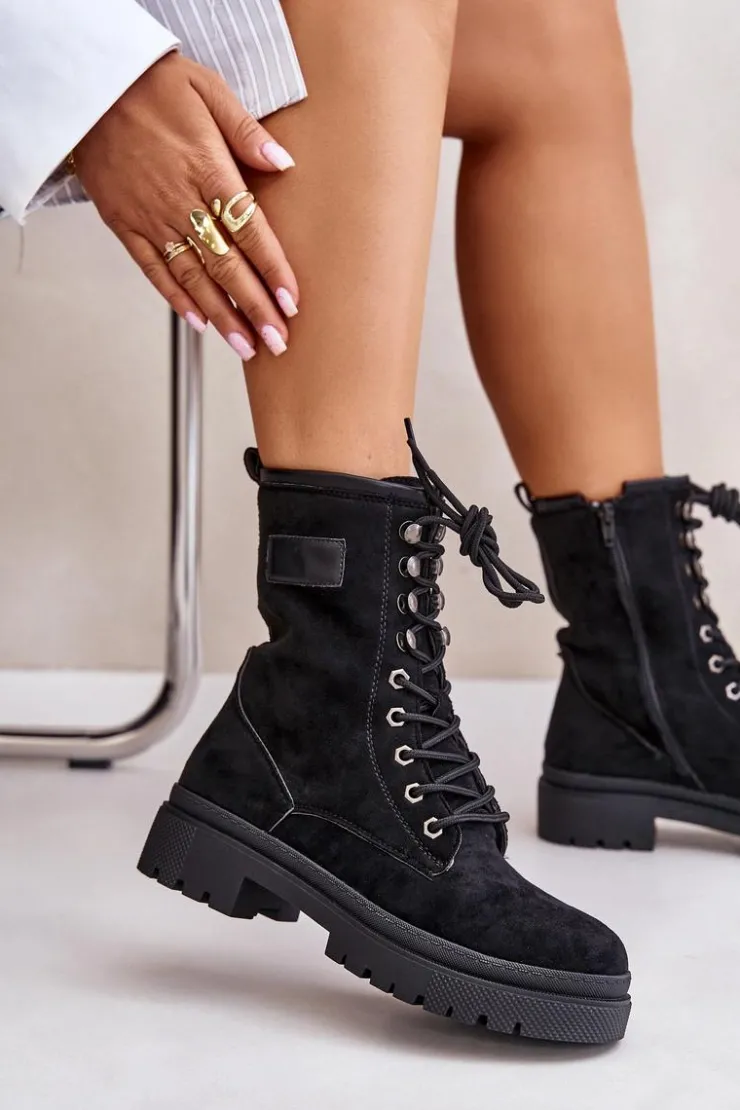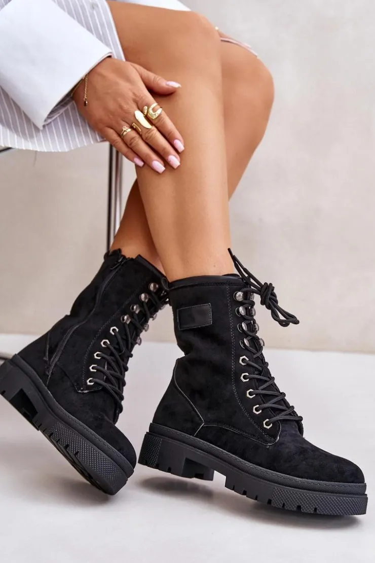 Workery damskie wykonane z eko zamszu. Osadzone na płaskim obcasie. Noski zaokrąglone. Zapinane na zamek oraz sznurowane. Klasyczny, modny fason, który dopełni wiele jesiennych stylizacji! Przy wyborze rozmiaru prosimy sugerować się tabelą rozmiarów.