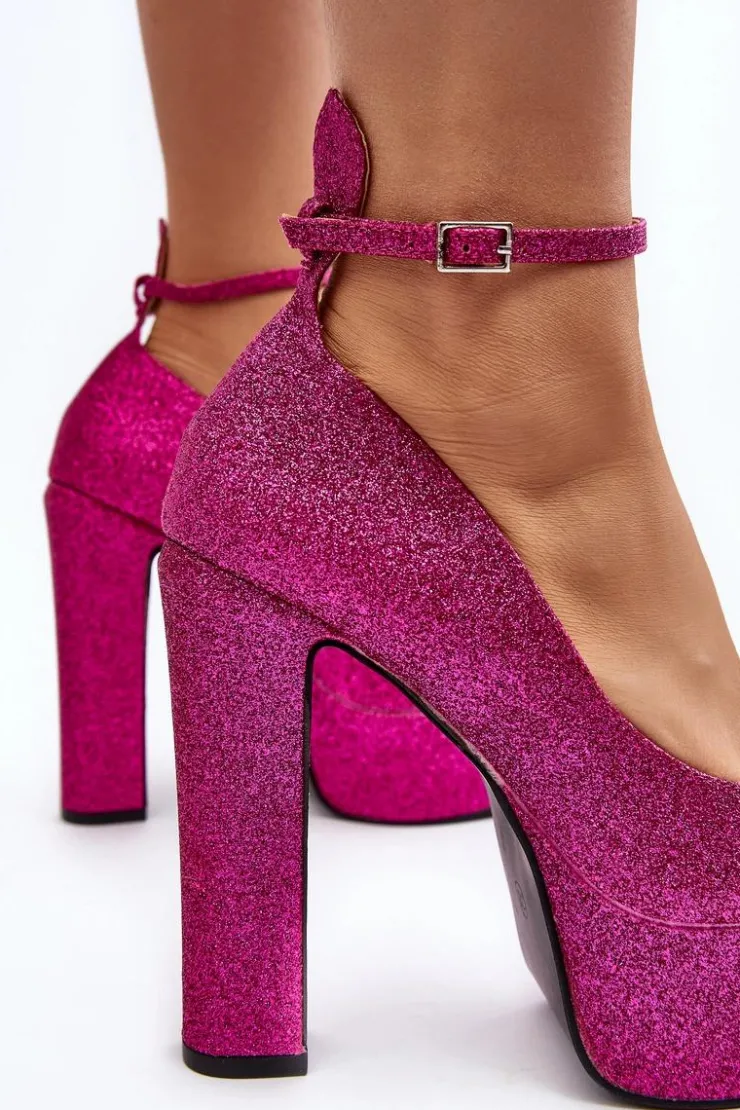 Brokatowe czółenka na słupku z masywną platformą z pewnością zachwycą kobiety, które kochają wysokie obcasy! Zapinane na sprzączkę z regulowanym paskiem. Miękka, eko skórzana wkładka zapewni komfort podczas użytkowania. Idealne na wieczorne wyjścia! Przy wyborze rozmiaru prosimy kierować się tabelą rozmiarów