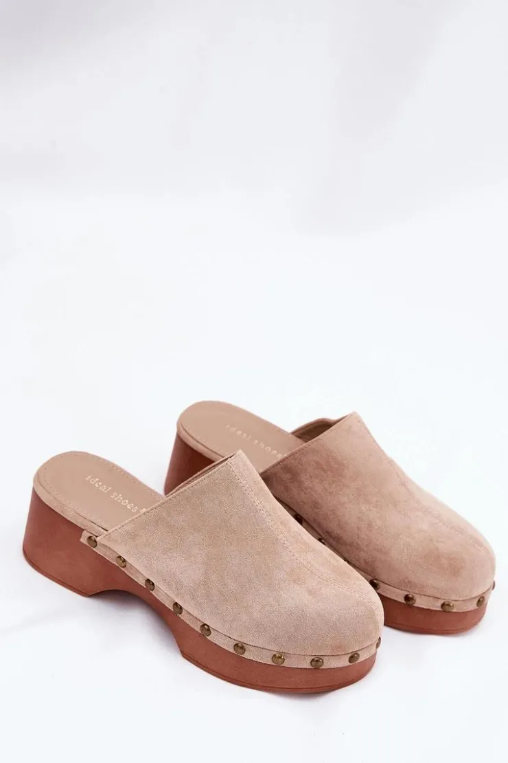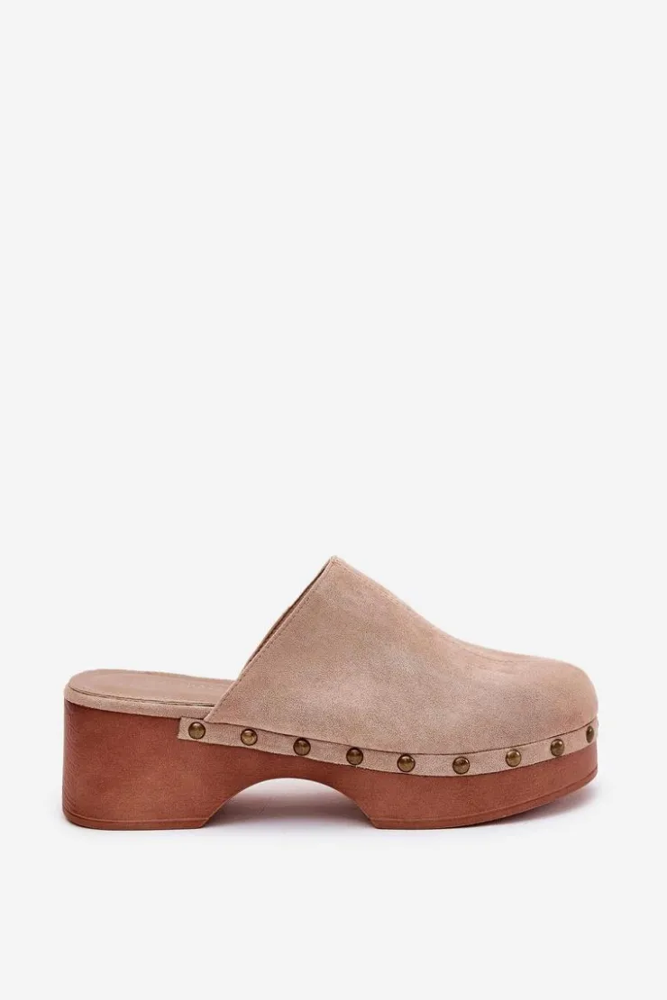 Lekkie klapki chodaki damskie wykonane z eko zamszu. Osadzone na platformie i koturnie. Ozdobione ćwiekami, które nadają im modnego i niepowtarzalnego charakteru. Wewnątrz znajduje się miękka eko skórzana wkładka, która gwarantuje komfort przez cały dzień. Klapki posiadają zakryte, zaokrąglone noski. Idealne na co dzień, doskonale komponują się z letnimi sukienkami, spódnicami i spodniami. Przy wyborze rozmiaru prosimy sugerować się tabelą rozmiarów.
