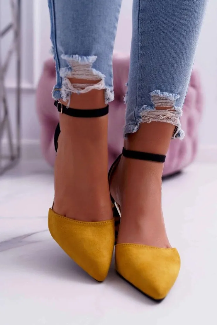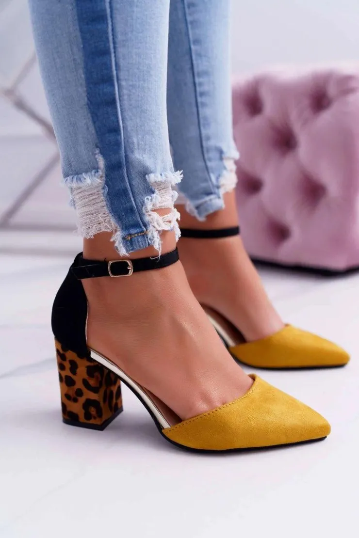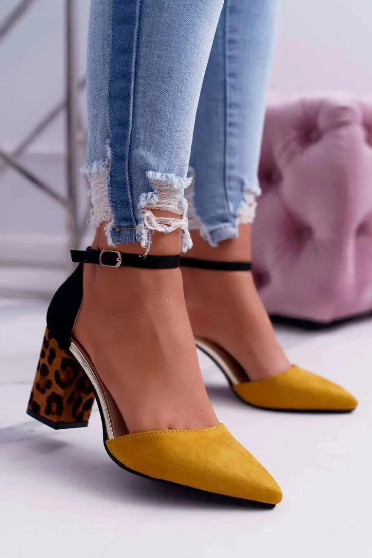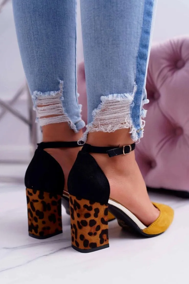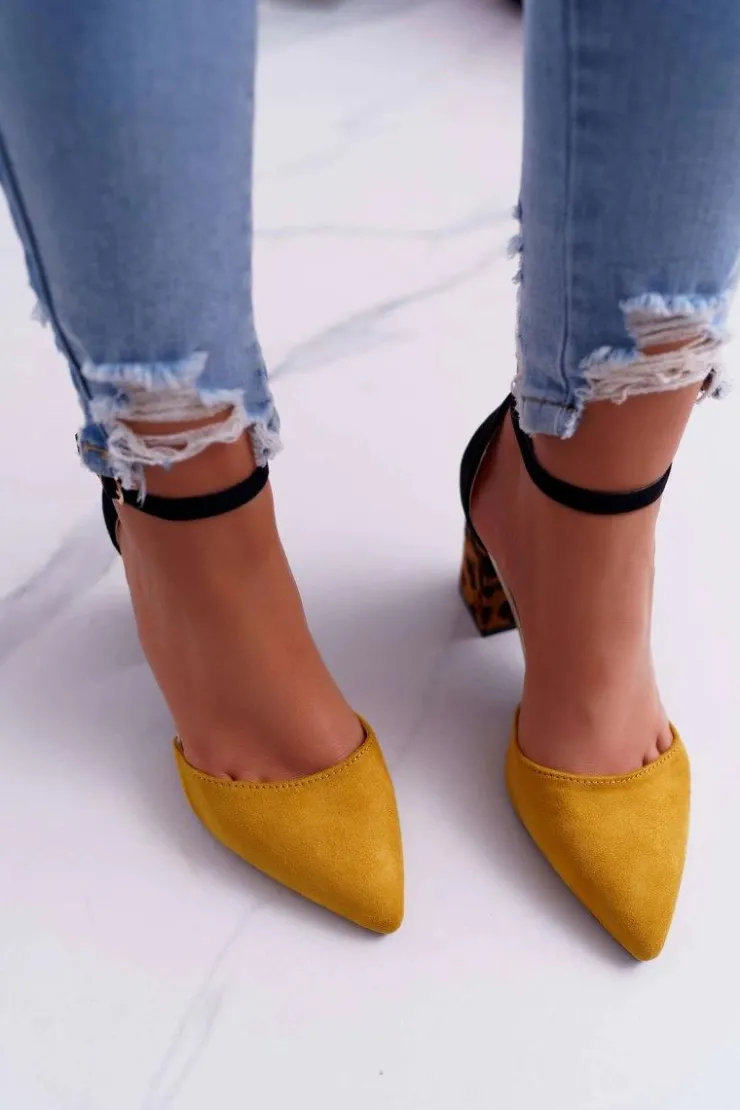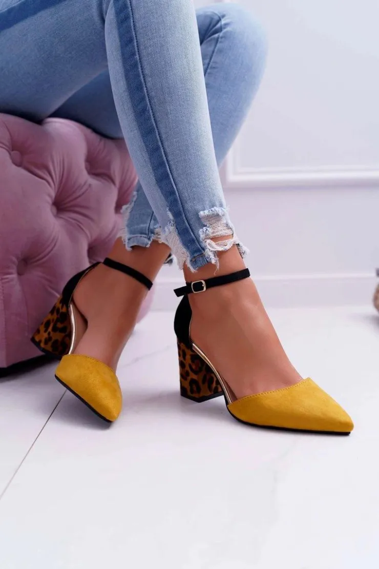 Damskie Boto Czółenka Damskie Na Słupku Panterki Żółte Ferri