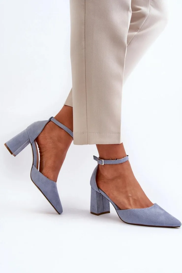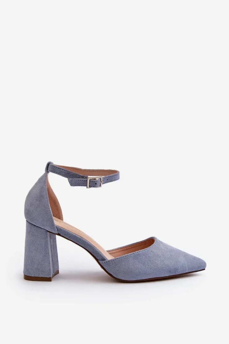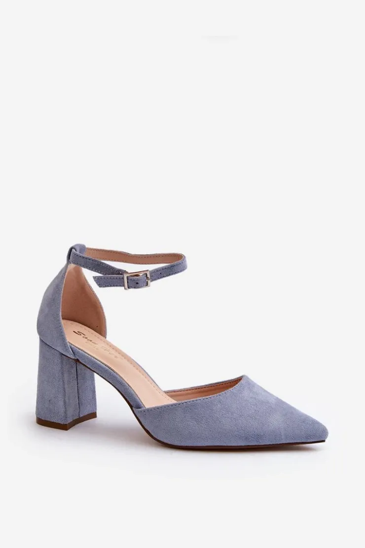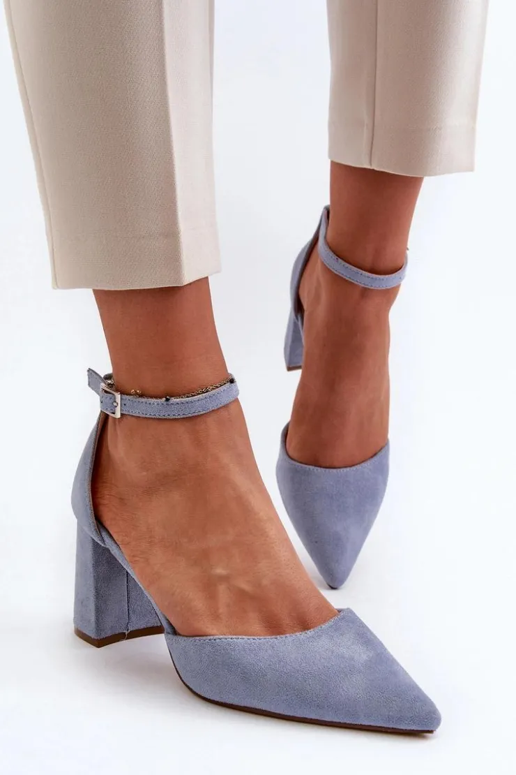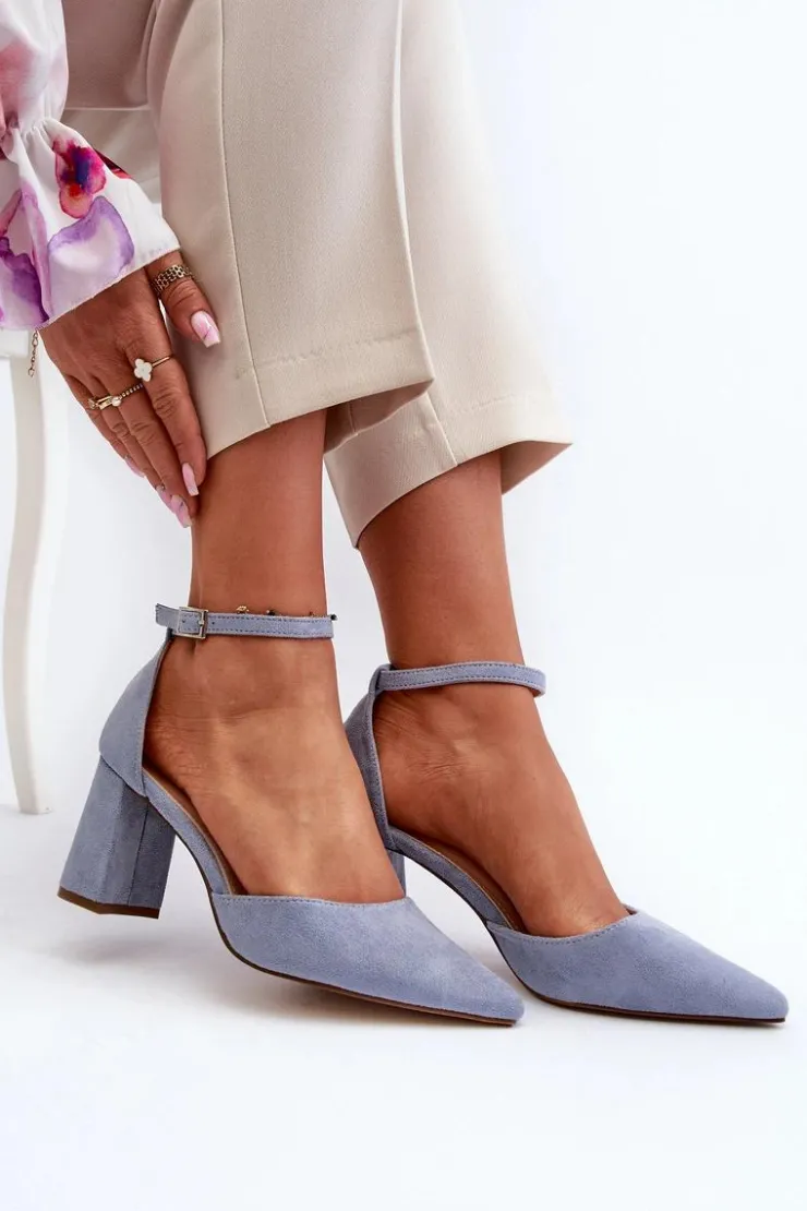 Stylowe czółenka damskie na obcasie w postaci słupka. Wykonane z eko zamszu. Noski w szpic optycznie wysmuklą nogi, a zapinanie na regulowany pasek ze sprzączką zapewni doskonałe dopasowanie. Idealne na wieczorne wyjścia oraz różne uroczystości rodzinne! Przy wyborze rozmiaru prosimy kierować się tabelą rozmiarów