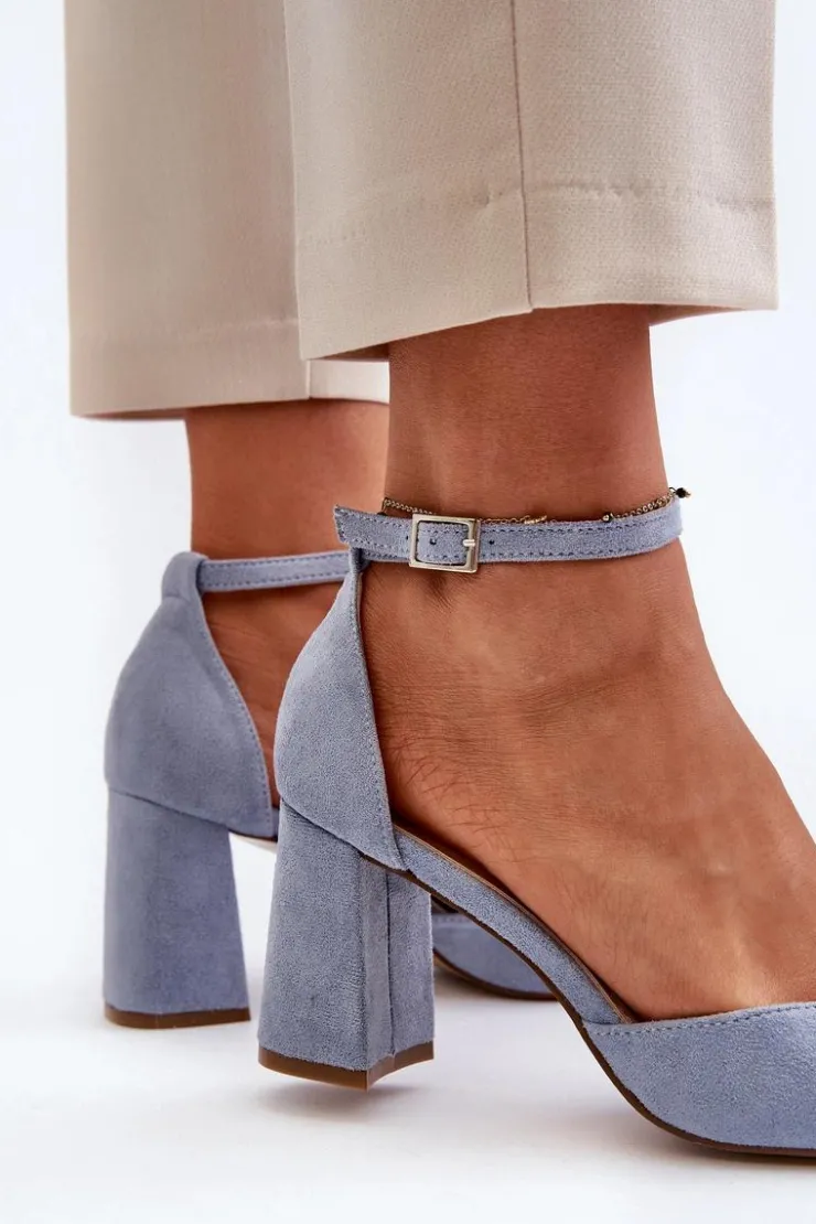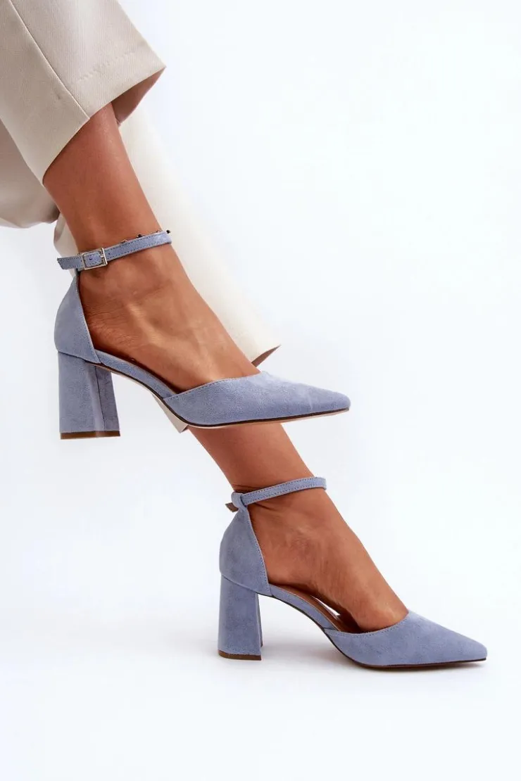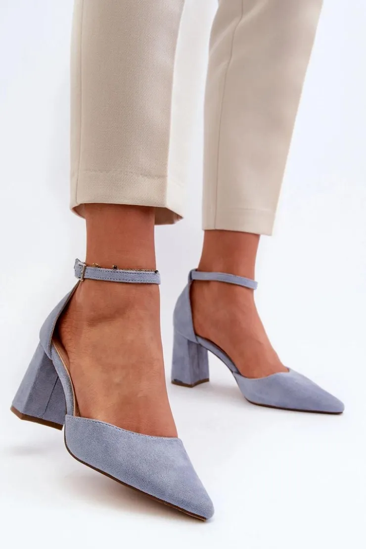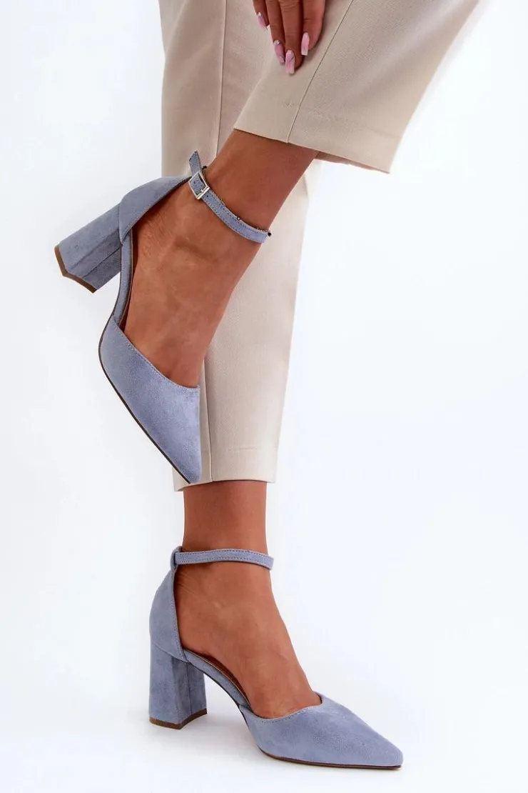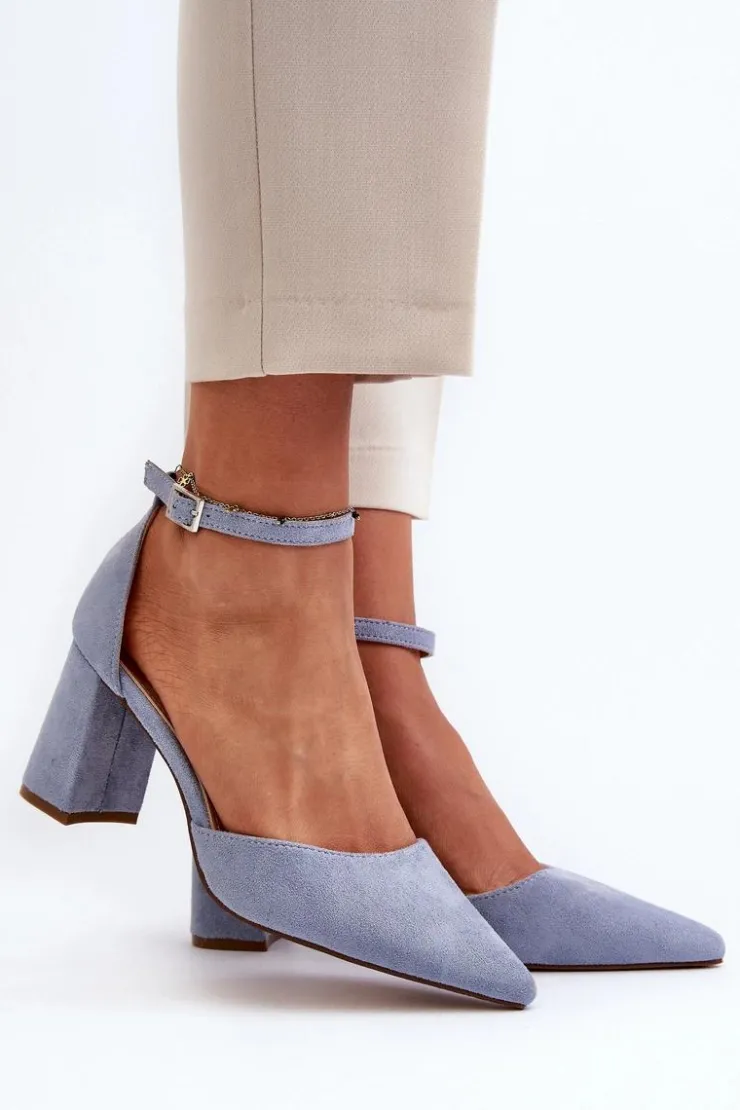 Stylowe czółenka damskie na obcasie w postaci słupka. Wykonane z eko zamszu. Noski w szpic optycznie wysmuklą nogi, a zapinanie na regulowany pasek ze sprzączką zapewni doskonałe dopasowanie. Idealne na wieczorne wyjścia oraz różne uroczystości rodzinne! Przy wyborze rozmiaru prosimy kierować się tabelą rozmiarów