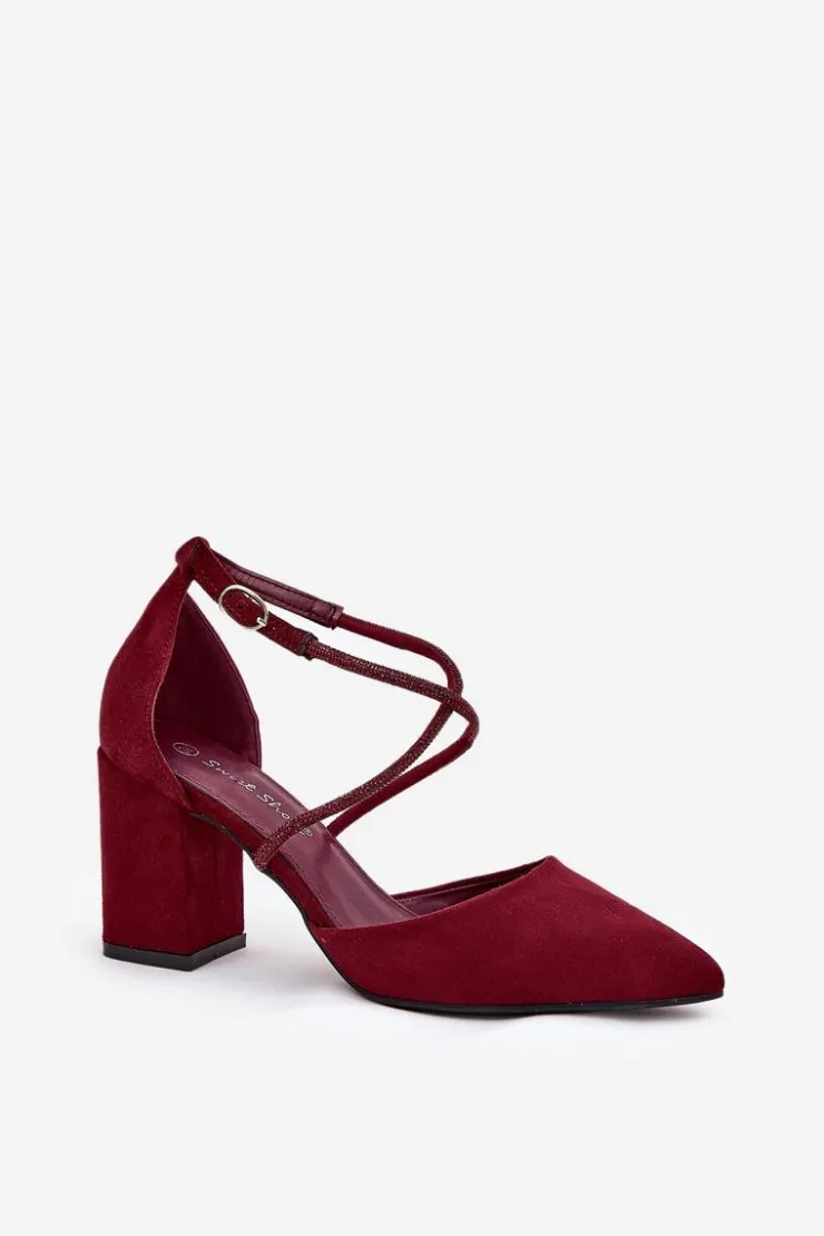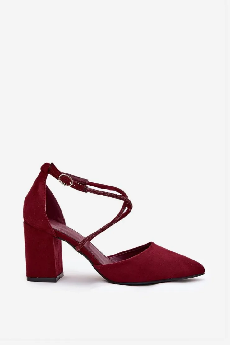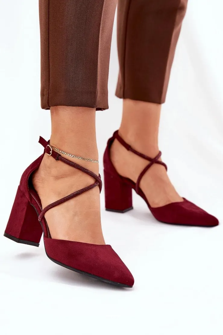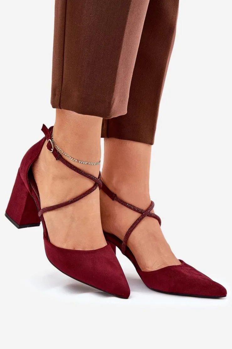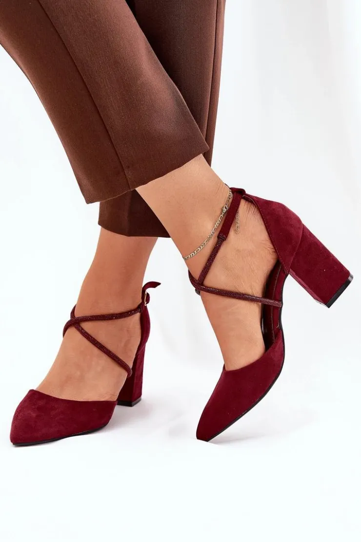 Czółenka damskie wykonane z eko zamszu. Osadzone na obcasie typu słupek. Model ten wyróżnia się przeplatającymi paseczkami, które ozdobione zostały cyrkoniami, które z pewnością przyciągną uwagę i nadają wyjątkowego blasku. Noski w szpic podkreślają ich elegancki wygląd, a zapinane na sprzączkę, zapewniają idealne dopasowanie do stopy. Te czółenka będą doskonałym wyborem na specjalne okazje, dodając każdej stylizacji szyku i odrobiny glamour. Przy wyborze rozmiaru prosimy sugerować się tabelą rozmiarów.