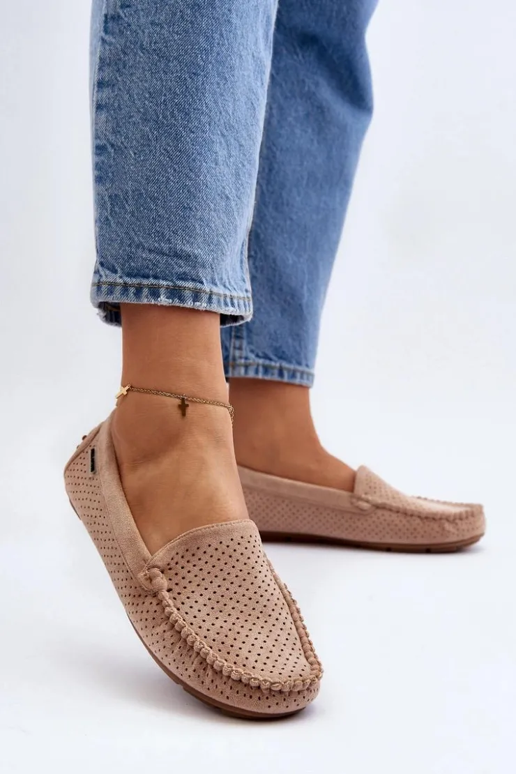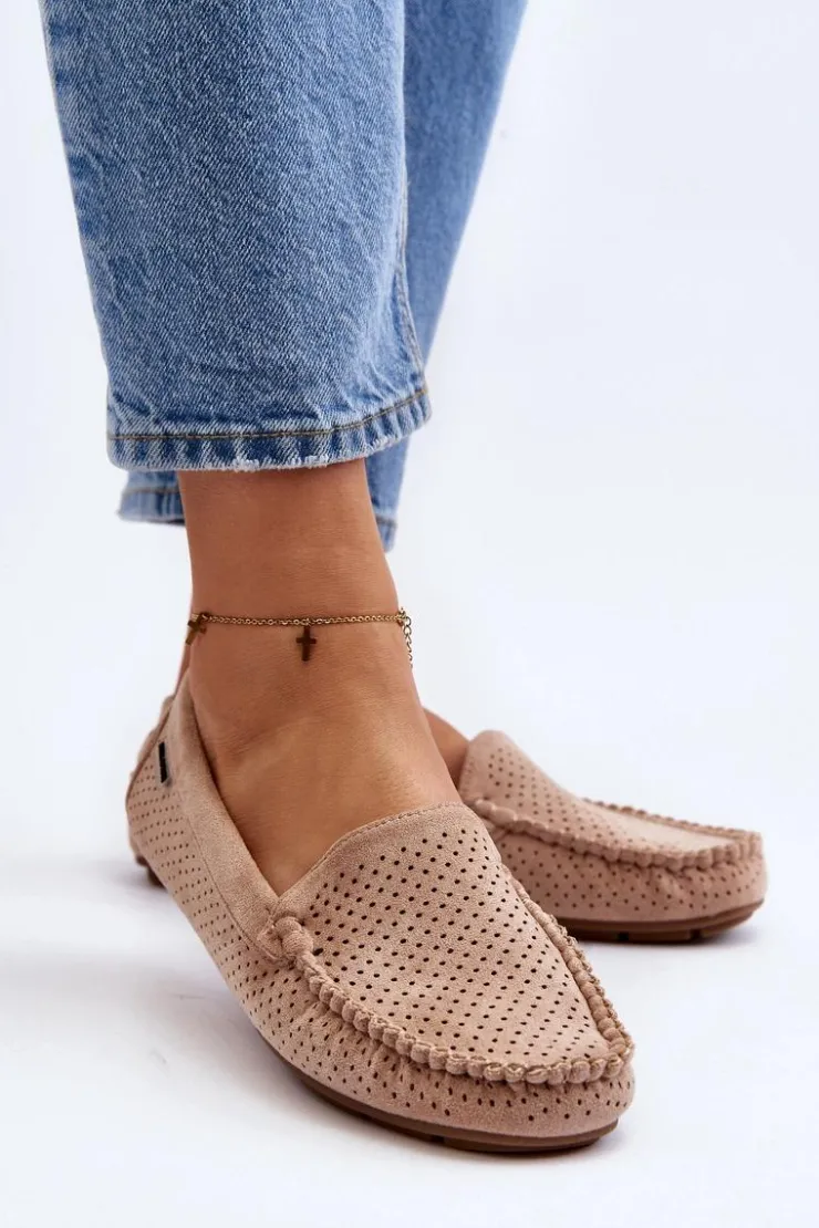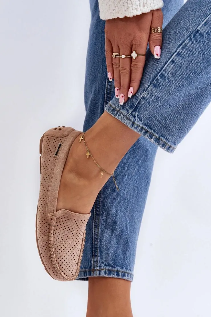 Ażurowe mokasyny damskie wykonane z eko zamszu. Osadzone na podeszwie z gumowego tworzywa. Noski zaokrąglone. Model ten posiada miękką, skórzaną wkładkę, która zapewni wygodę podczas noszenia. Z pewnością świetnie będą prezentować się w wielu stylizacjach! Przy wyborze rozmiaru prosimy sugerować się tabelą rozmiarów.