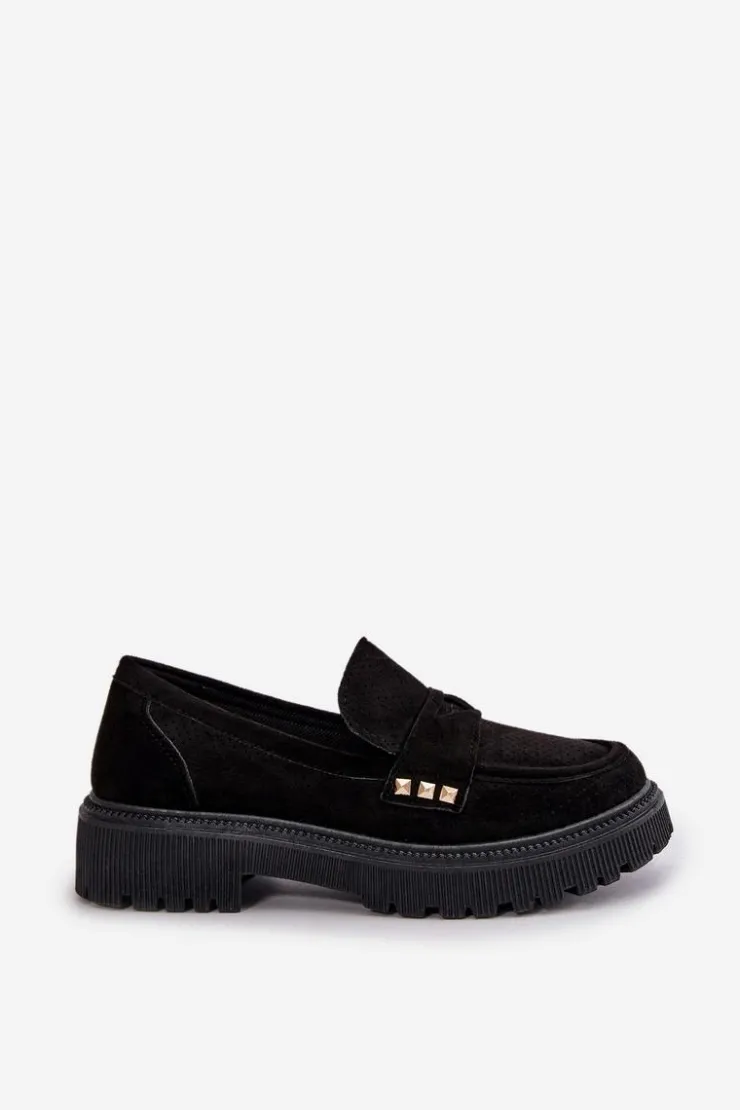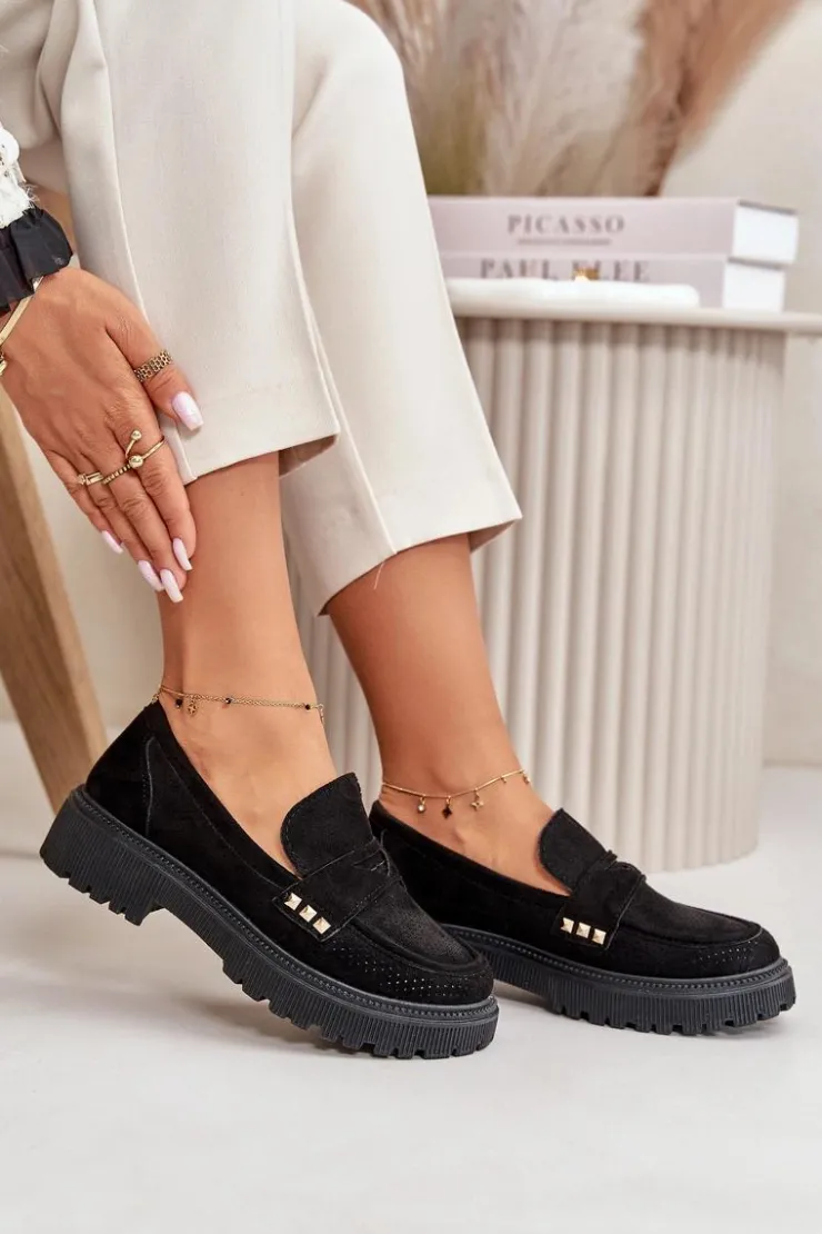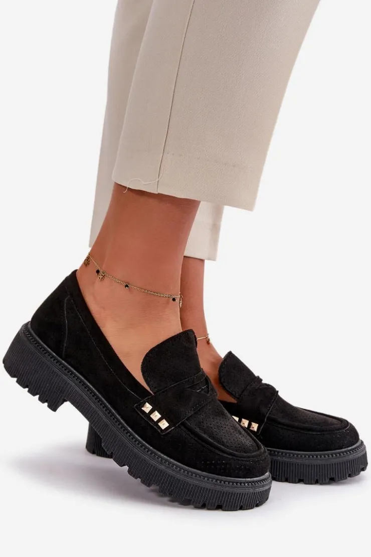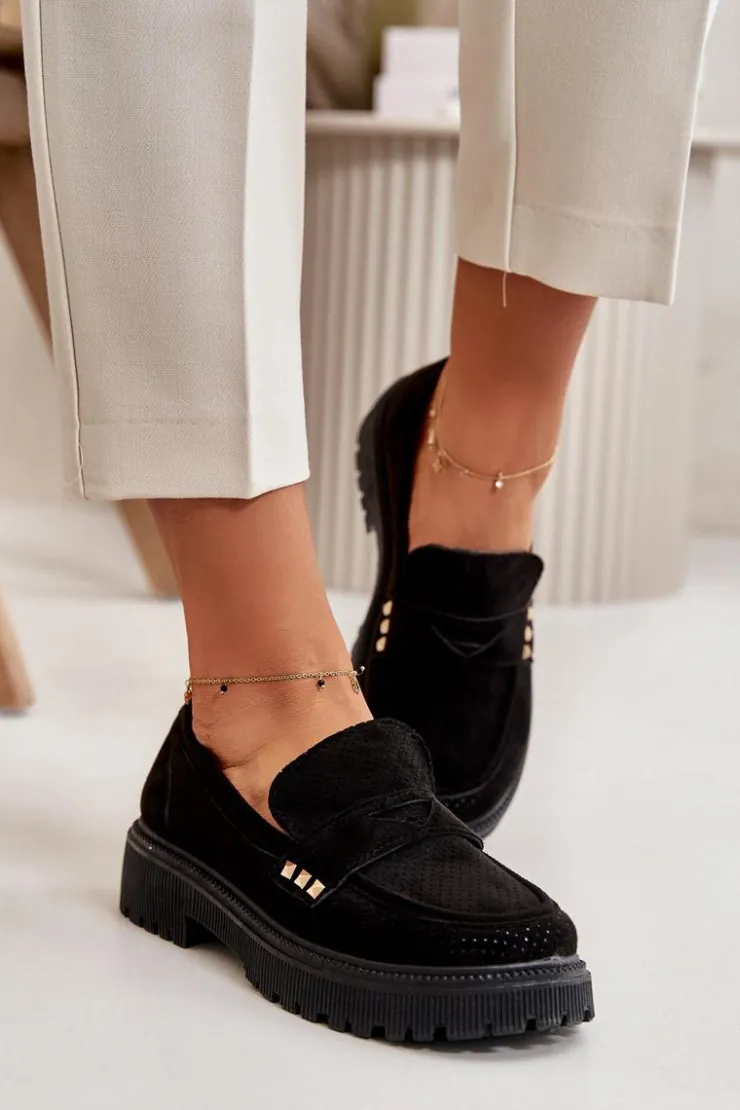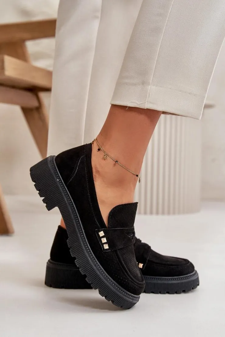 Mokasyny damskie wykonane z eko zamszu. Osadzone na płaskim obcasie i platformie, zapewniają komfort noszenia przez cały dzień. Noski są zaokrąglone, co dodaje im klasycznego wyglądu. Model ten jest nie tylko modny, ale także praktyczny, dzięki ażurowej cholewce, która pozwala stopie oddychać. Te mokasyny świetnie sprawdzą się zarówno w codziennych, jak i bardziej eleganckich stylizacjach! Przy wyborze rozmiaru prosimy sugerować się tabelą rozmiarów.